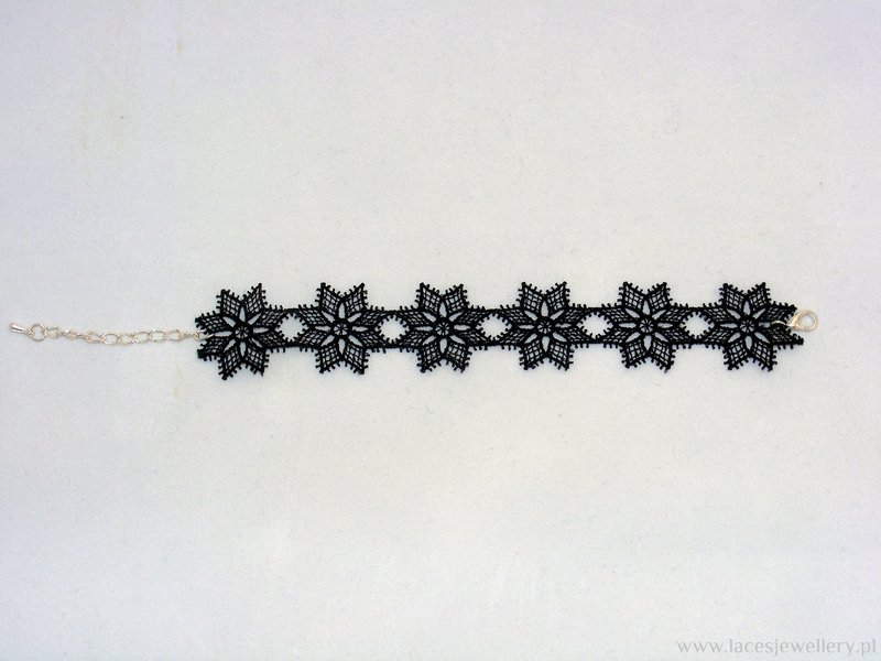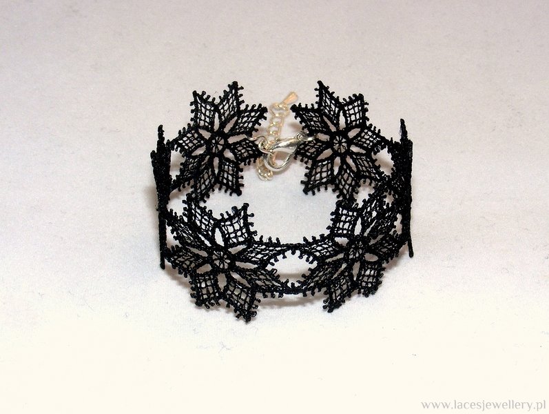 Piękna bransoletka koronkowa w kolorze czarnych gwiazd. Ręcznie wykonana oraz usztywniona tak aby zachowała odpowiedni kształt i była odporna na zanieczyszczenia, wodę, pot itp. Zapinana jest na łańcuszek. Fantastyczna ozdoba na co dzień, świetnie prezentuje się z klasycznymi jeansami i t-shirtem jak i również do wieczornej sukni.