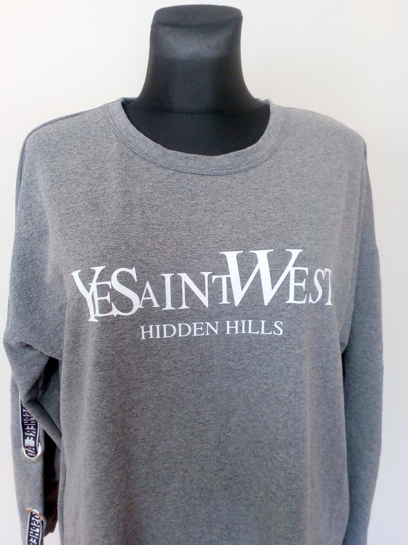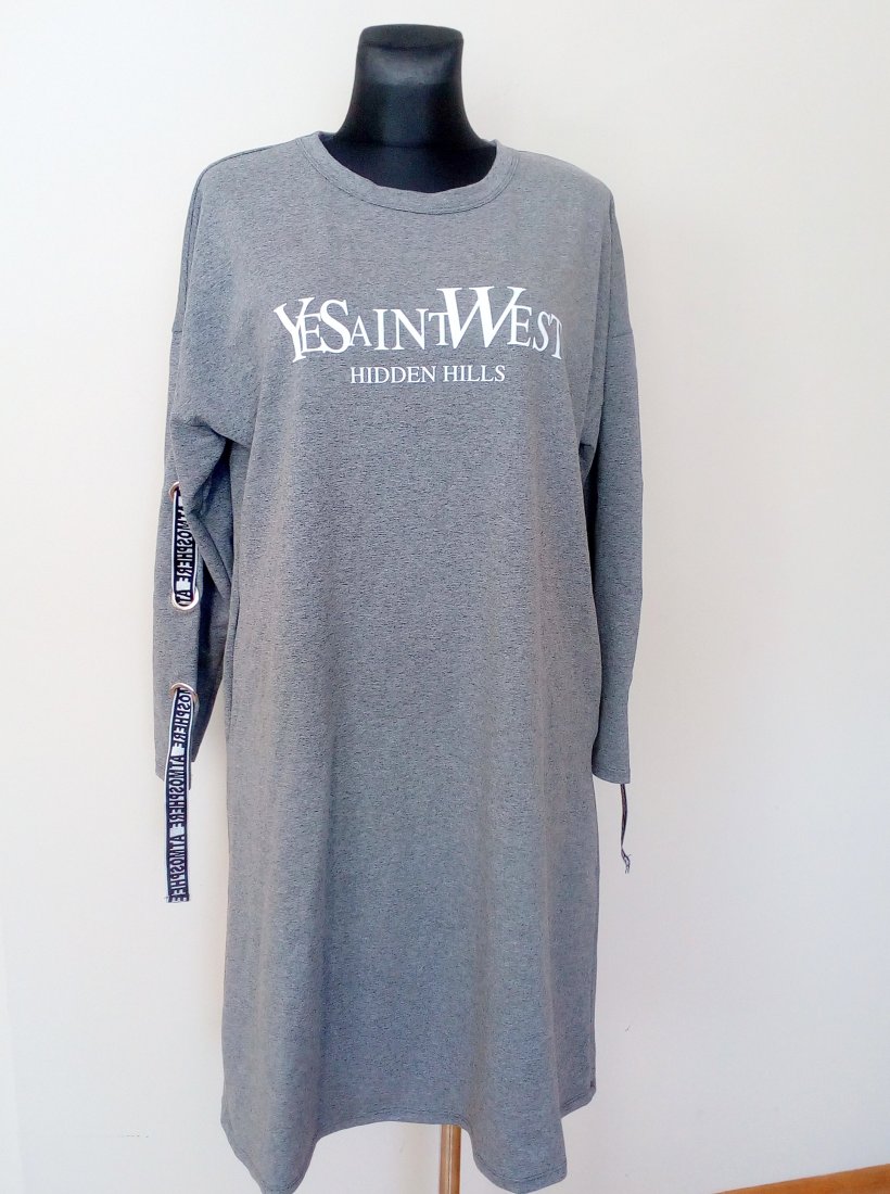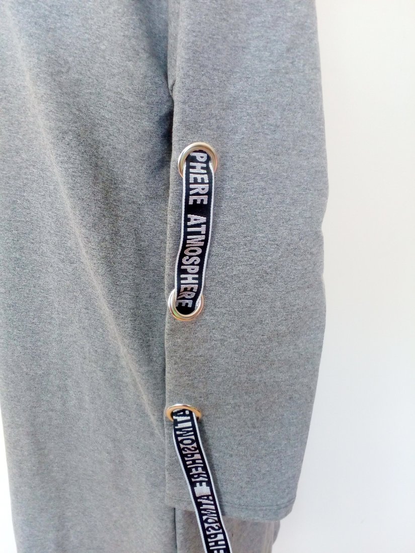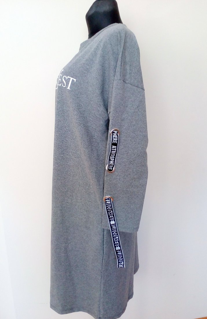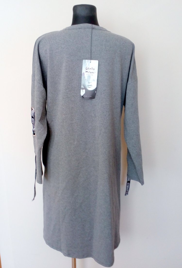 Nowa sukienka w szarym kolorze, z ozdobnymi taśmami na rękawach, rękawy obniżane, w szwach bocznych wpuszczane kieszenie, uszyta z dobrej jakości dzianiny