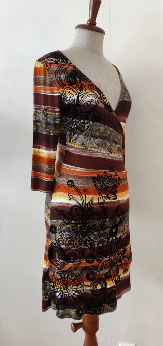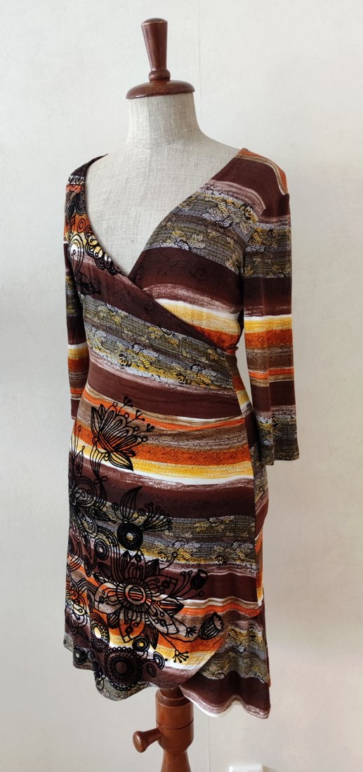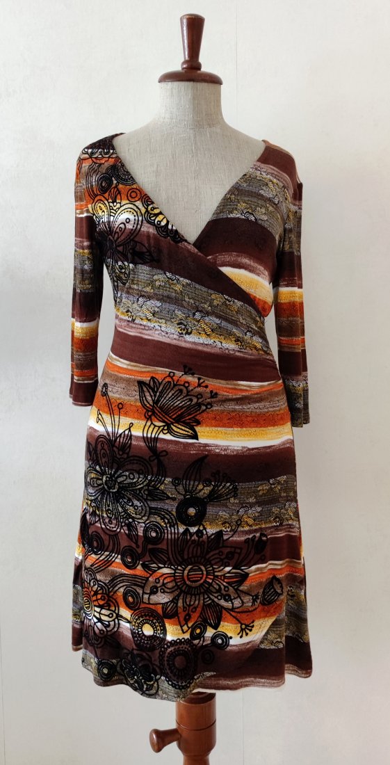 Sukienka z zakładanym dekoltem w pięknej kolorystyce z czarnym kwiatowym nadrukiem po jednej stronie. Materiał jest rozciągliwy.
