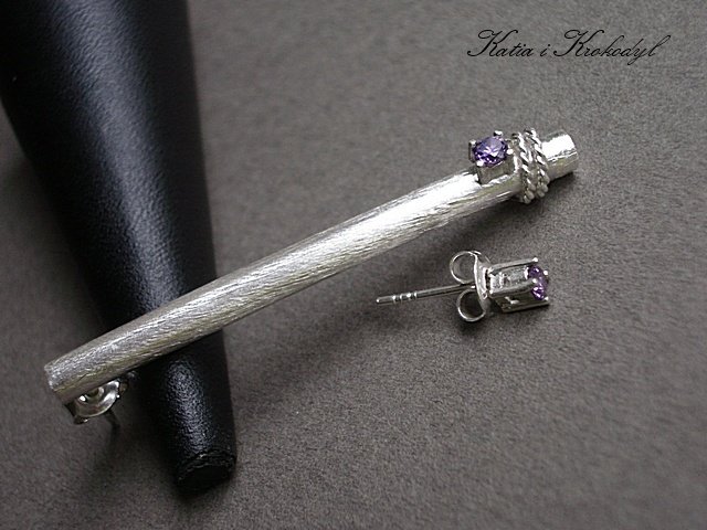 Asymetryczne kolczyki wykonane ręcznie od podstaw ze srebra [pr. 925] w połączeniu z cyrkoniami [3mm]. Srebrna rurka mocno satynowana [długość 5,2cm; śr,4mm]. Biżuteria ozdobnie zapakowana