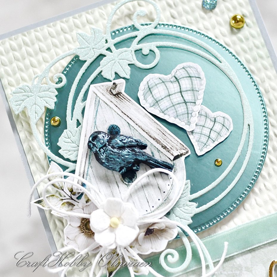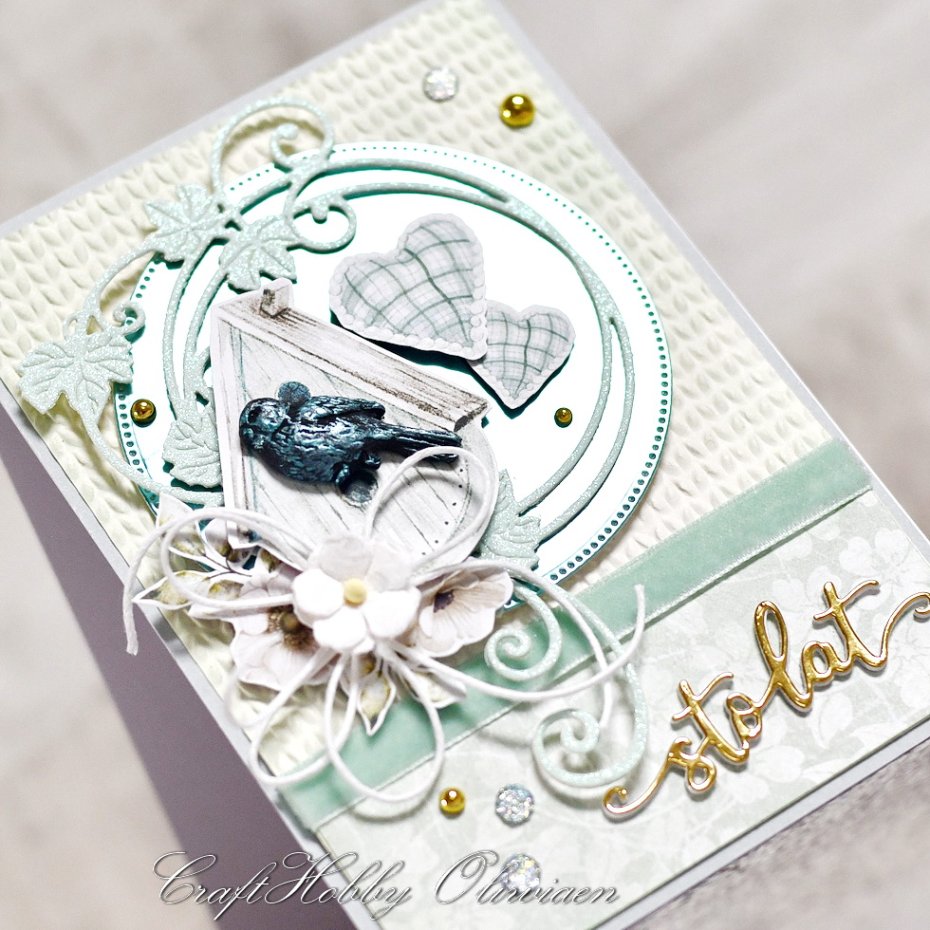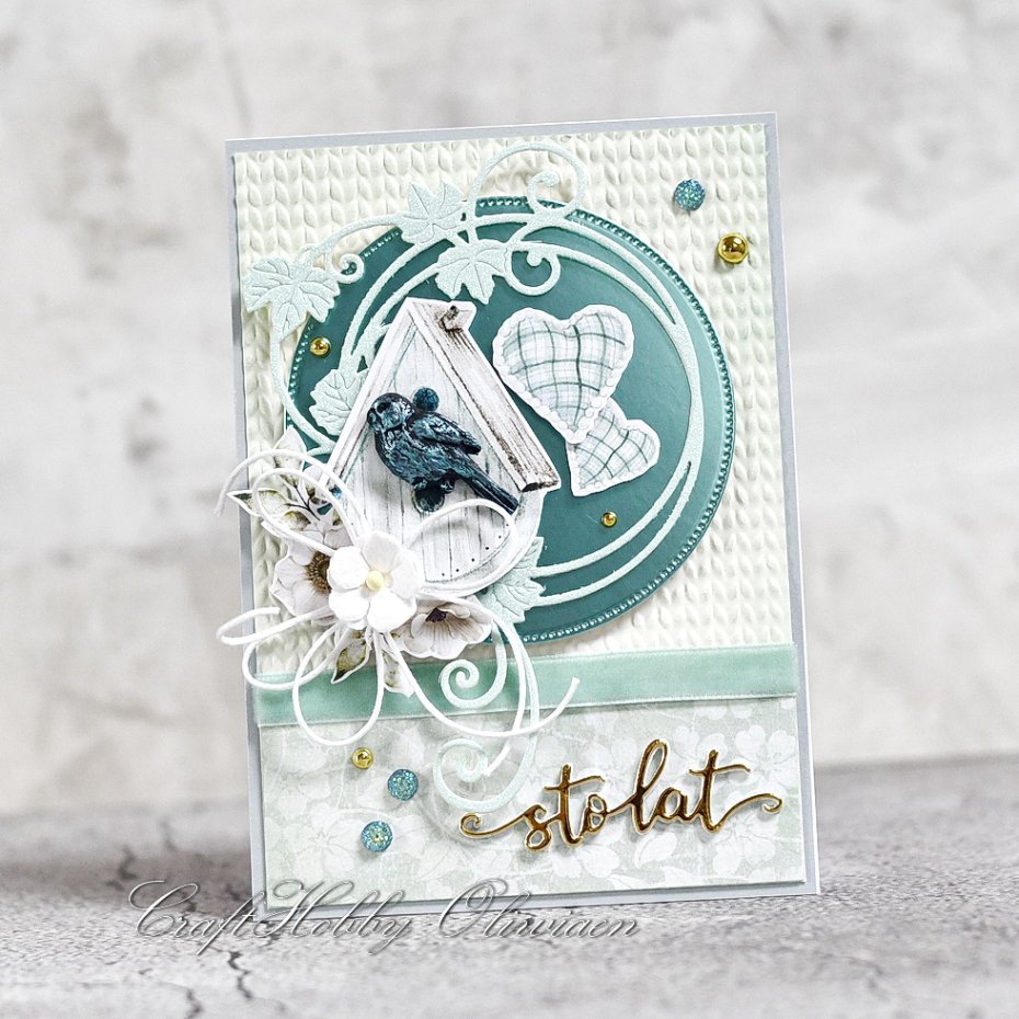 Kartka wykonana z bezkwasowych papierów do scrapbookingu, w tym embossowanego we wzór sweterka, ozdobiona misterną ramką z brokatowego kartonu, wyciętymi z papieru motywami, ptaszkiem z masy plastycznej, mini kwiatuszkiem mulberry, aksamitną tasiemką, napisem ze złotego metalicznego kartonu, złotymi perełkami, akrylowymi kamyczkami i sznureczkiem.