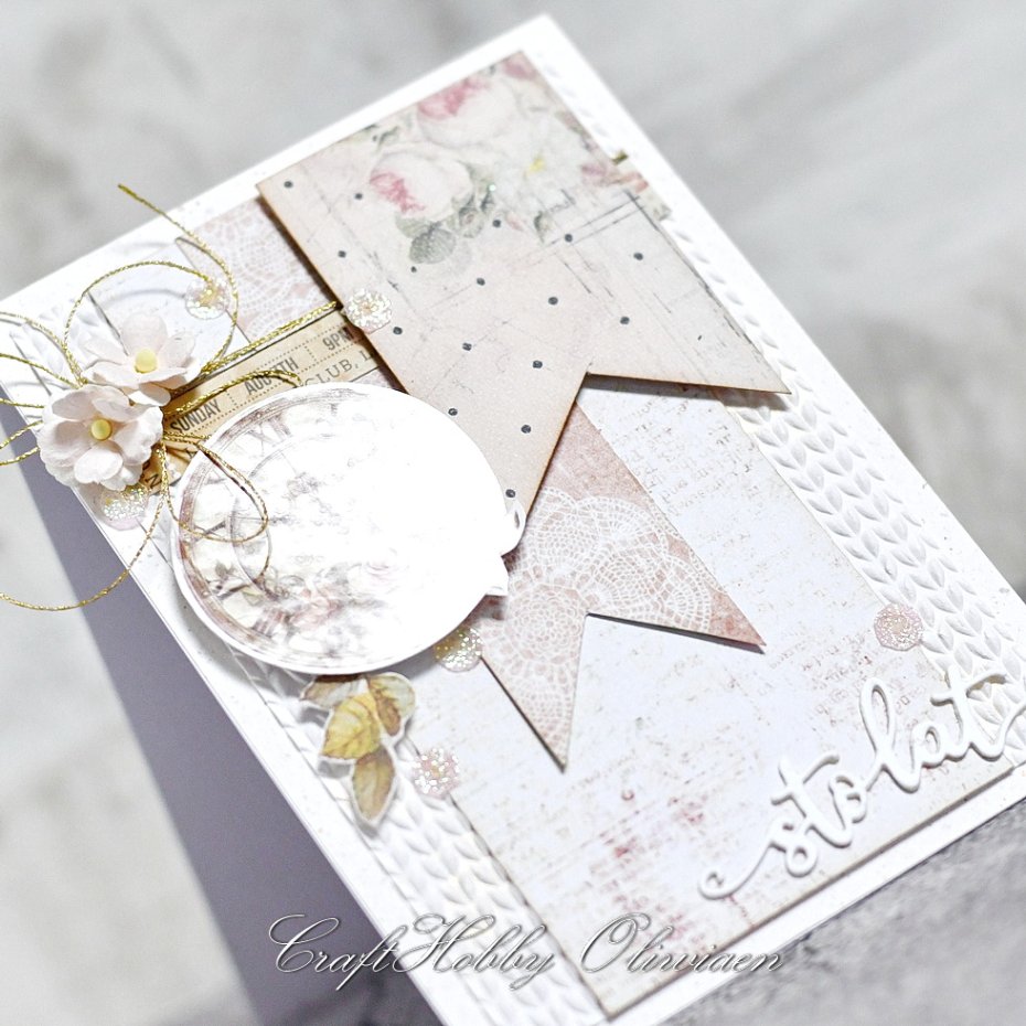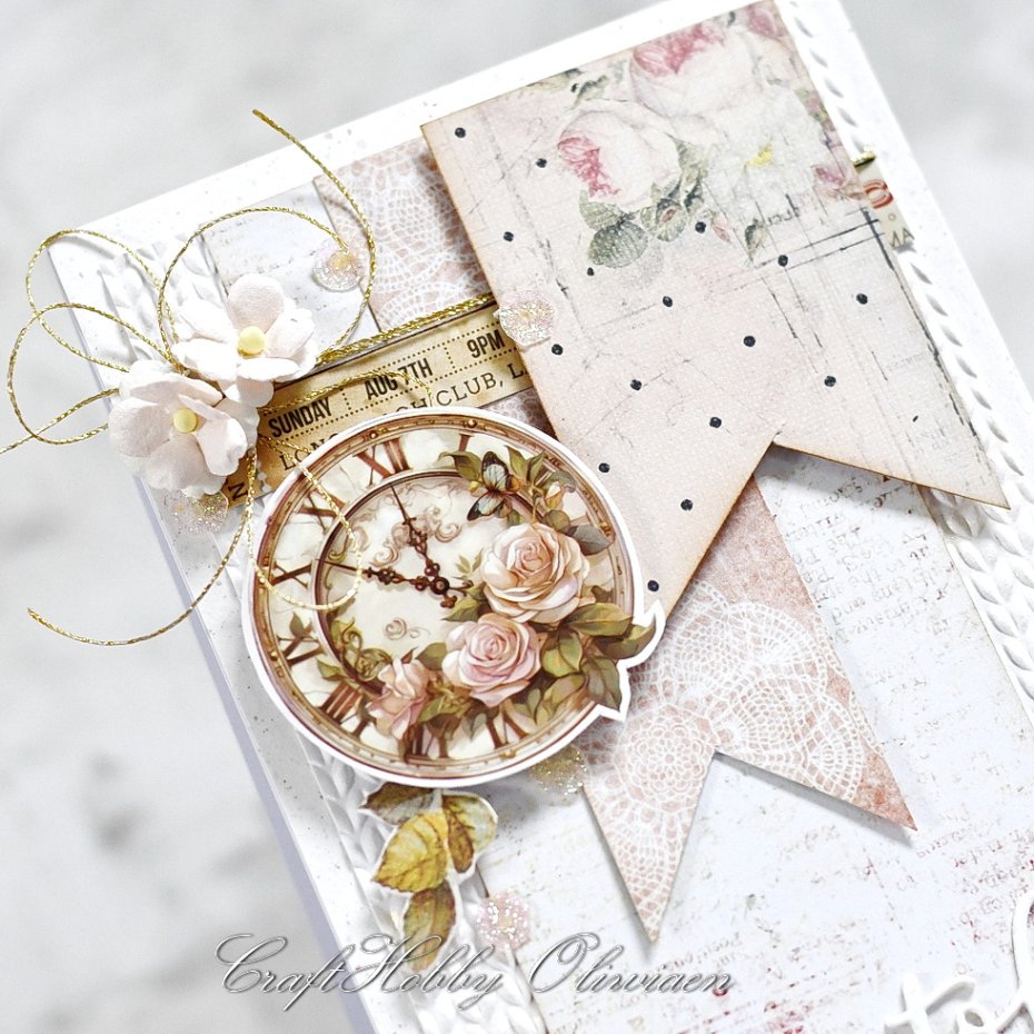 Kartka wykonana z bezkwasowych papierów do scrapbookingu, w tym embossowanego we wzór sweterka, ozdobiona wyciętymi z papieru motywami, tarczą zegara shabby chic z błyszczącego kartonu, mini kwiatuszkami mulberry, złotą nitką i brokatowymi cekinami.