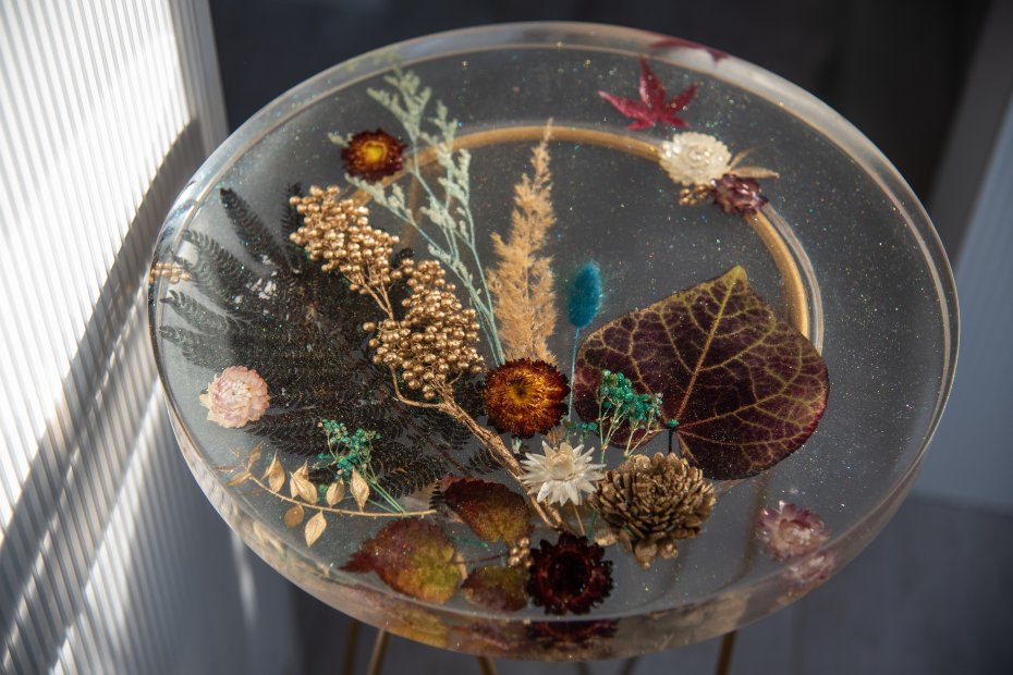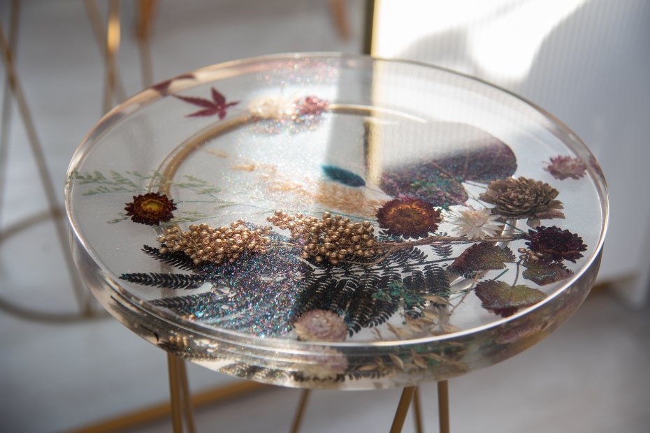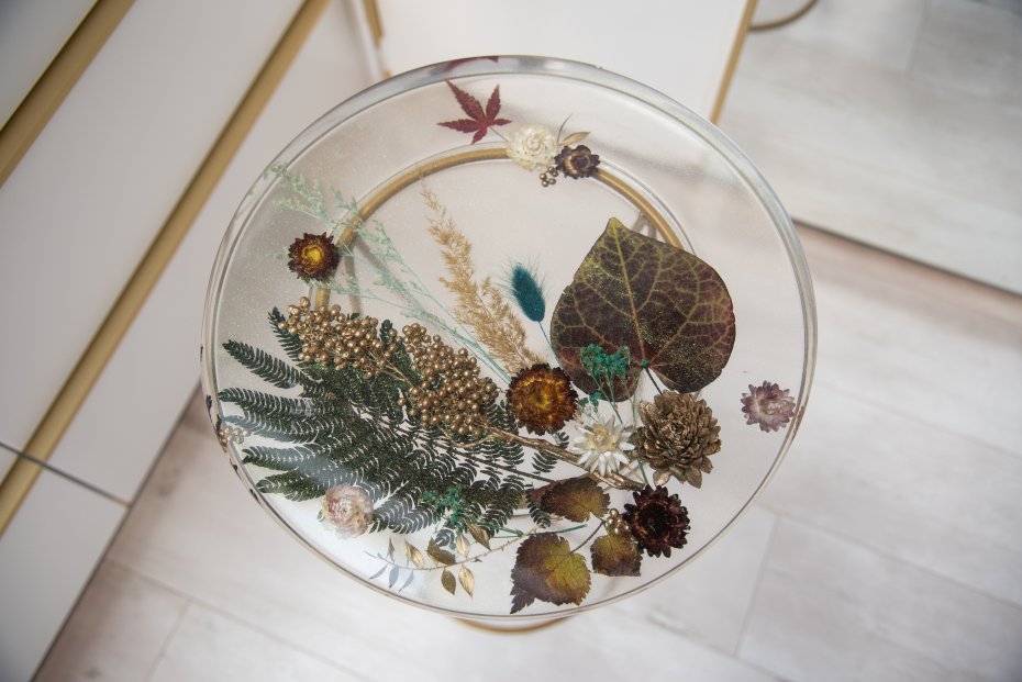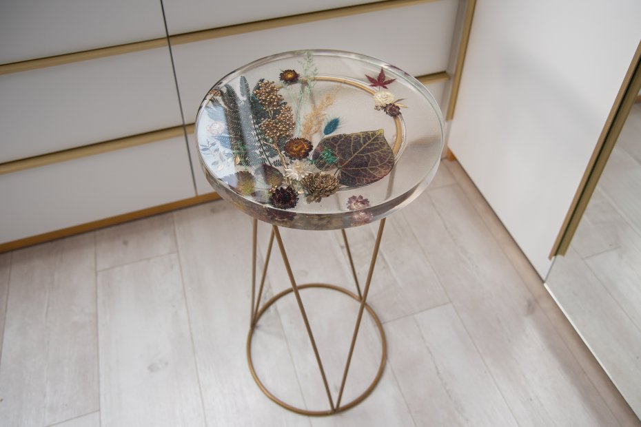 Stoliczek dzięki niewielkim (średnica blatu 35cm, grubość blatu 3cm, wysokość 63cm) rozmiarom może być stoliczkiem kawowym, pięknym kwietnikiem lub stoliczkiem nocnym. Blat został wykonany ręcznie z żywicy epoksydowej (zabezpieczony lakierem), w którym zostały zatopione suszone kwiaty. Uniwersalności dodają metalowe nogi z delikatnego złota a zatopione w blacie opalizujące na różne kolory drobinki, pięknie odbijając światło dodają elegancji. Na żywo stoliczek prezentuje się jeszcze piękniej, szczególnie mieniąc się w słońcu lub sztucznym świetle.