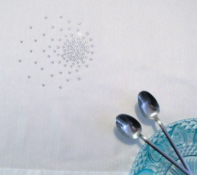 subtelny i elegancki bieżnik w kolorze złamanej bieli, ozdobiony na środku migoczącymi sztrasami.