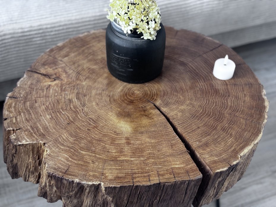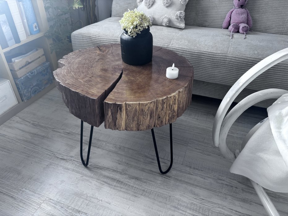 Piękny stolik z plastra dębu o wymiarach wysokość 50 cm, średnicy 50-56 cm i grubości plastra 12 cm. A więc konstrukcja stabilna . Piękne słoje, wygląd i kształt napewno upiększy każde pomieszczenie i będzie zachwycać oko każdego dnia. Polakierowane lakierem ekologicznym półpołysk.