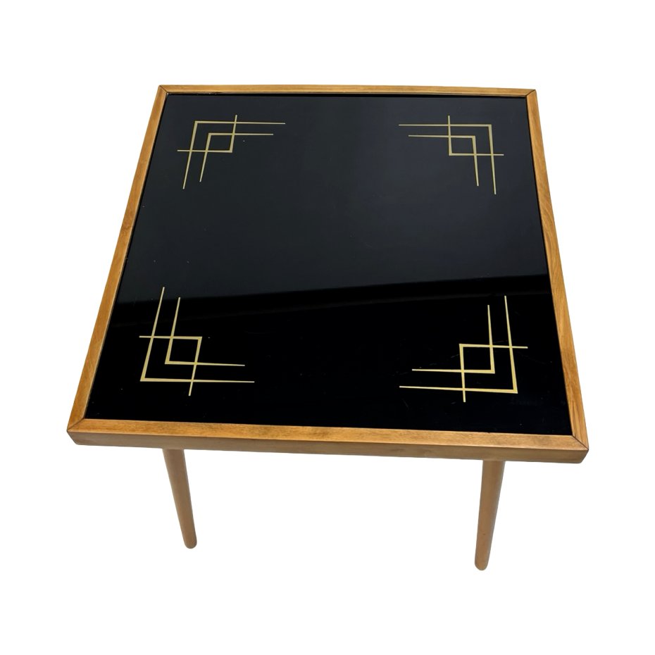 Stolik posiada szklany blat z dekoracyjnym, geometrycznym nadrukiem w stylu modernistycznym oraz smukłą, drewnianą konstrukcję typową dla niemieckiego wzornictwa powojennego. Połączenie ciepłego drewna z chłodnym szkłem tworzy bardzo elegancki, ponadczasowy efekt.