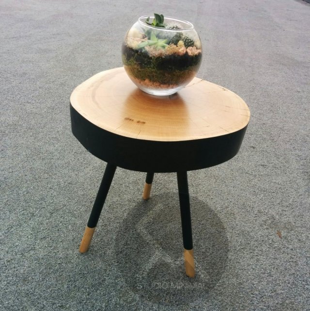 Stolik wykonany z plastra dębowego drzewa oraz dębowych nóżek.