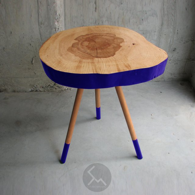 Stolik wykonany z plastra bukowego drzewa oraz bukowych nóżek. Granatowe (indygo) elementy pokryte ekologiczną trwałą farbą. Całość zabezpieczona lakierem najwyższej twardości, co daje gwarancję wodoodporności i braku zarysowań.Możliwość zamówienia stolika z pęknięciem. Wysokość 43cm, średnica 45cm. Można zamówić wyższy lub niższy. Może służyć jako stolik nocny, stolik na drobne rzeczy, na lampę, lub do salonu. Z tyłu piękna filcowa metka Studio Minimal podbity wytrzymałymi podkładkam.