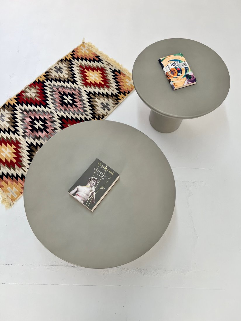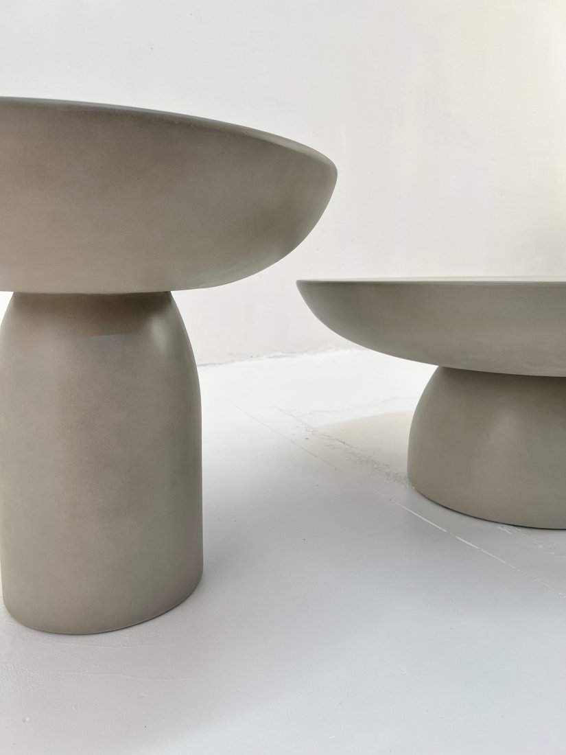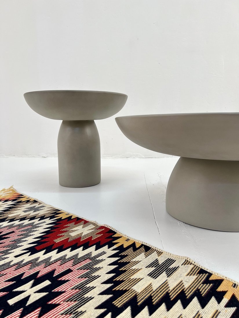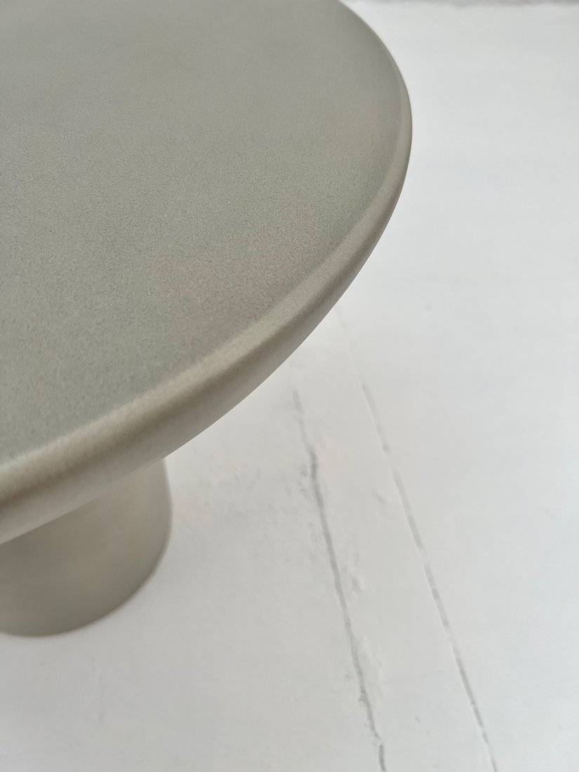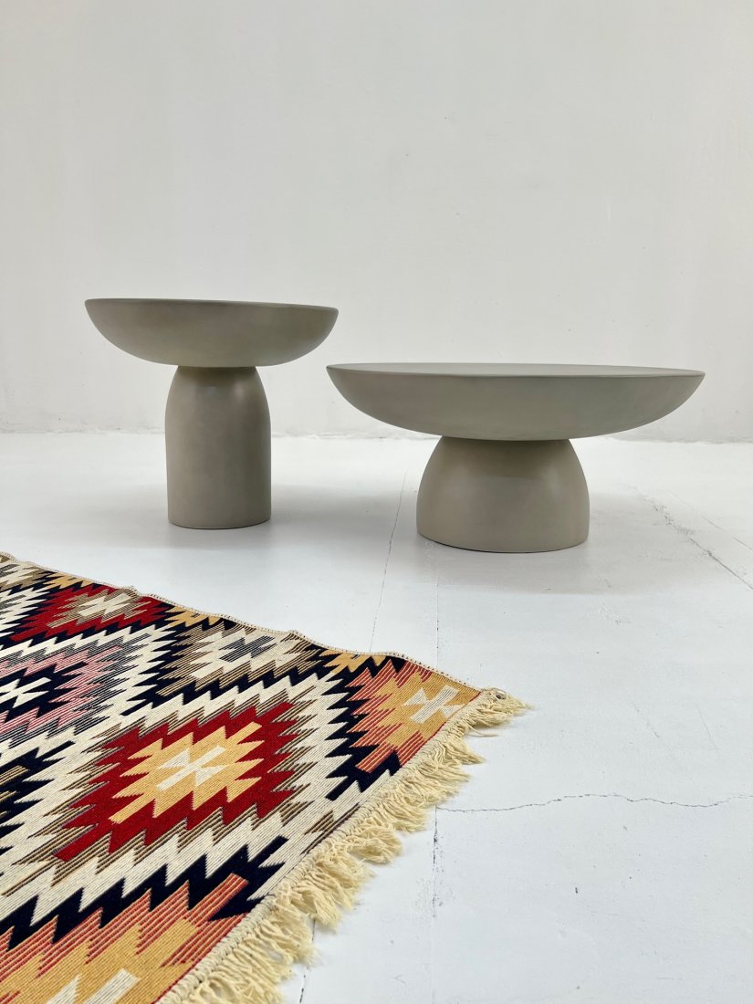 Stolik kawowy wykonany z cementu oraz z włókna szklanego w kolorze szaro-beżowym. Posiada podkładki ochronne na spodzie, które zapobiegają uszkodzeniom i zużyciu podłogi. Dostępna jest również wersja stolika o mniejszej średnicy blatu na wyższej nodze, dzięki czemu razem tworzą idealny duet.