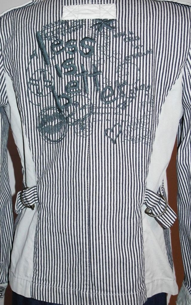 Paseczki w kolorze jasno szary i ciemny granatowy.Stójka,mankiety na zatrzaski, po bokach sprzączki regulujące dopasowanie, dwie kieszenie. Na plecach wyszyty napis "less is better", zapinana na metalowe guziki.Super dla kogoś, kto lubi markowe ubrania ale bez "neonu" :-)