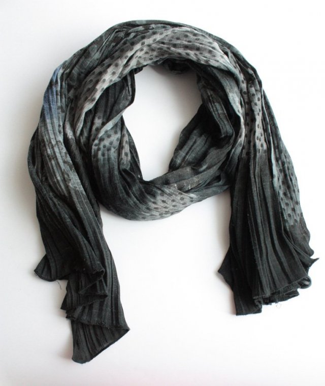 Miękki, duży szal w różnorodne wzory w ciemnych tonacjach. Szal posiada ciekawą fakturę, sprawia wrażenie lekko plisowanego.