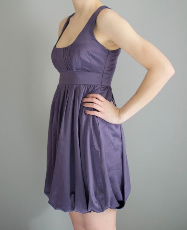 Śliczna sukienka bombka, w pięknym fioletowym kolorze. ładnie wycięty dekolt, zdobiony zakładkami z materiału. Zapinana z boku na zamek. Świetna na przyjęcia okolicznościowe: śluby, wesela.