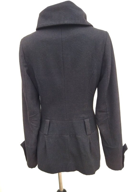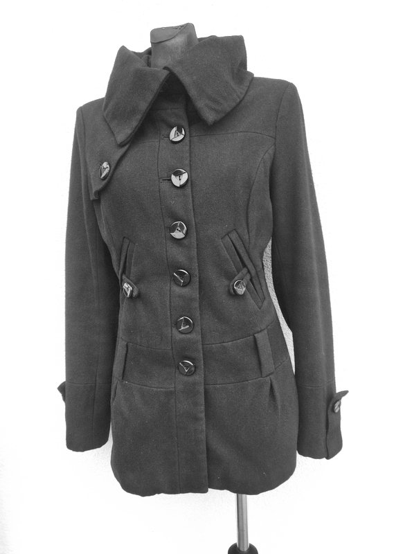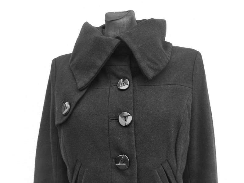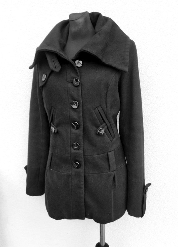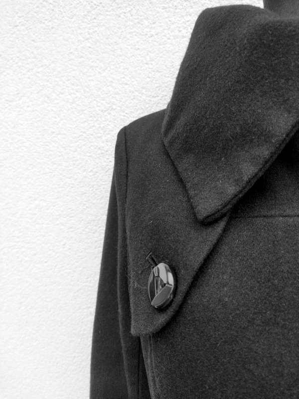 Dłuższa kurtka z tkaniny w czarnym kolorze , z licznymi detalami. Zapinana na guziki. Na wzorzystej podszewce w cętki.