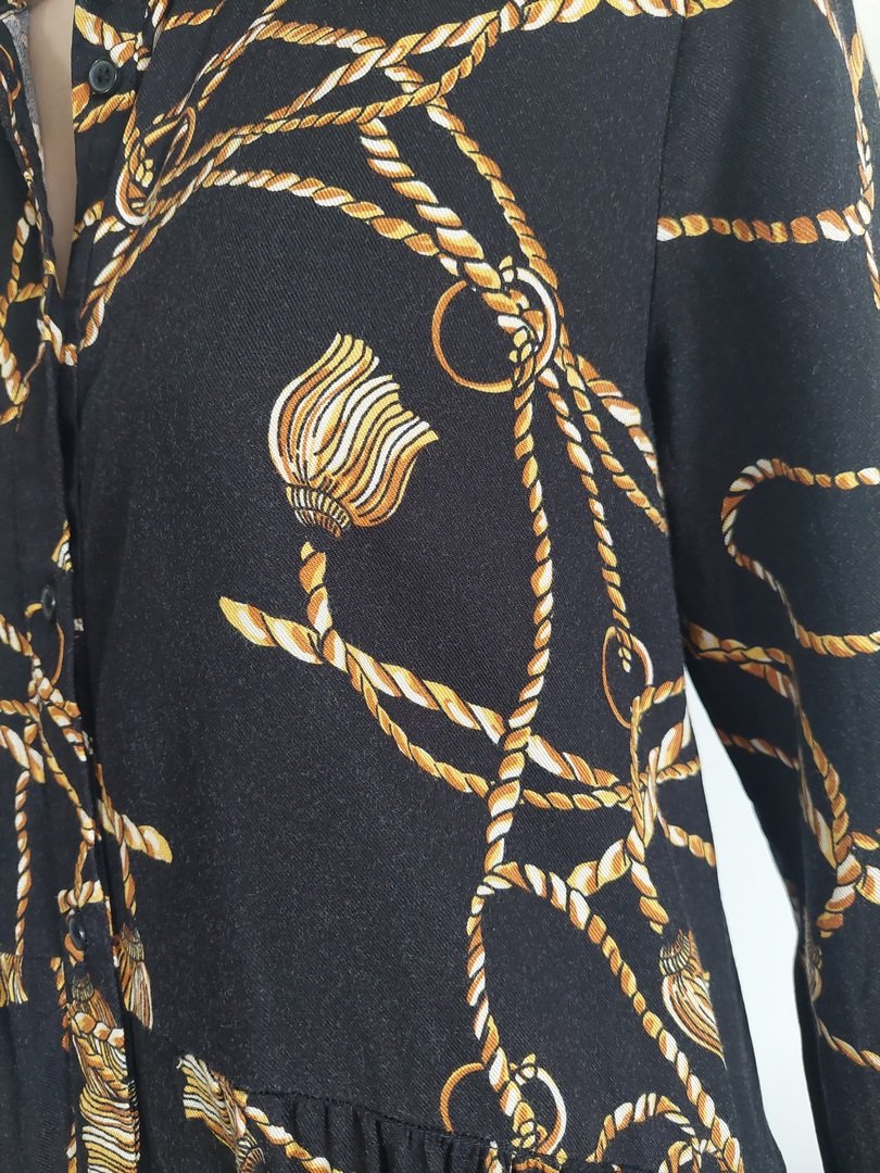 sukienka marki stradivarius, zapinana na małe guziczki, w bardzo dobrym stanie. odcięta w pasie (tył biodra), dół przymarszczony. rozmiar z metki L, proszę sprawdzić wymiary. na manekinie małe 38, materiał z lekkim "meszkiem"brak metki, być może bawełna z domieszką. stan bardzo dobry, w dwóch miejscach na dole niewielkie, niezauważalne zaciągnięcie.