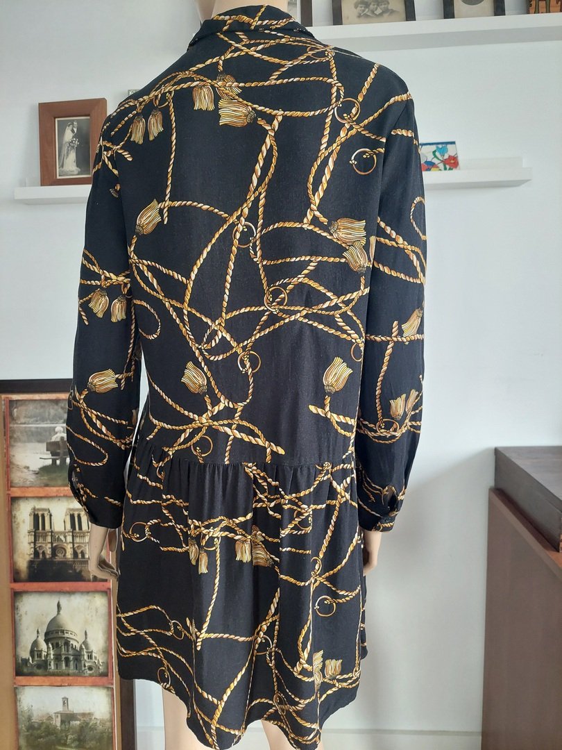 sukienka marki stradivarius, zapinana na małe guziczki, w bardzo dobrym stanie. odcięta w pasie (tył biodra), dół przymarszczony. rozmiar z metki L, proszę sprawdzić wymiary. na manekinie małe 38, materiał z lekkim "meszkiem"brak metki, być może bawełna z domieszką. stan bardzo dobry, w dwóch miejscach na dole niewielkie, niezauważalne zaciągnięcie.