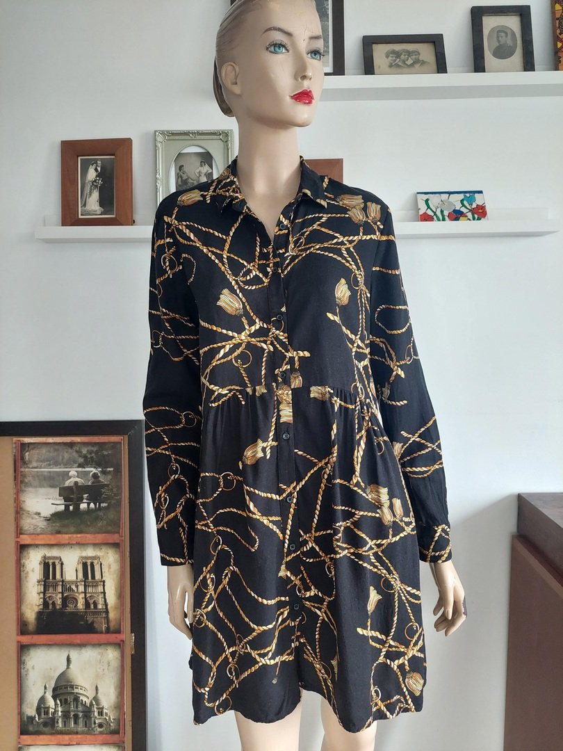 sukienka marki stradivarius, zapinana na małe guziczki, w bardzo dobrym stanie. odcięta w pasie (tył biodra), dół przymarszczony. rozmiar z metki L, proszę sprawdzić wymiary. na manekinie małe 38, materiał z lekkim "meszkiem"brak metki, być może bawełna z domieszką. stan bardzo dobry, w dwóch miejscach na dole niewielkie, niezauważalne zaciągnięcie.