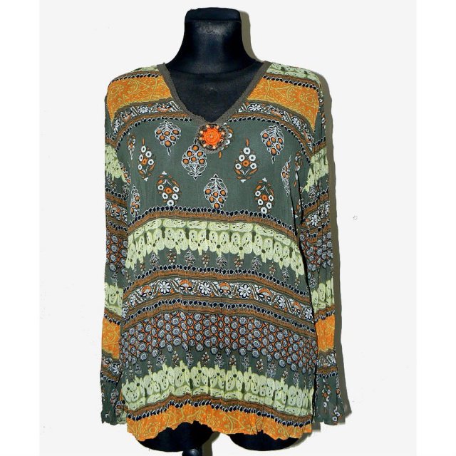 Lekka cieniutka bluzka w cudne wzory, przy dekolcie ozdobiona mandalą z haftu i koralików.