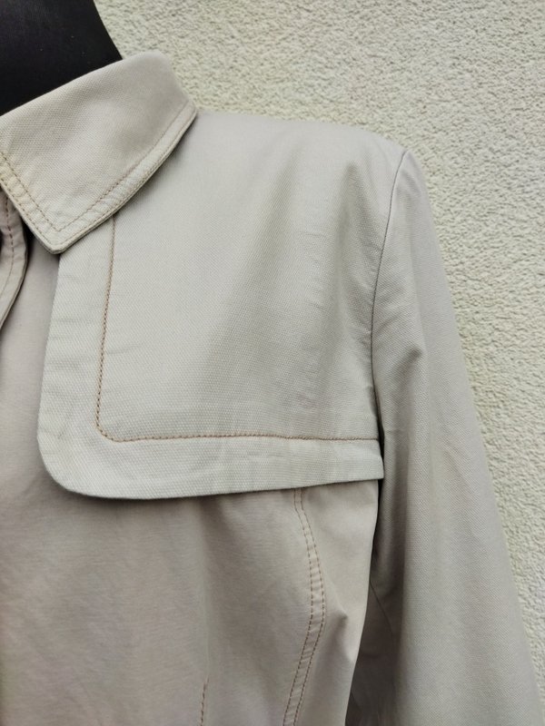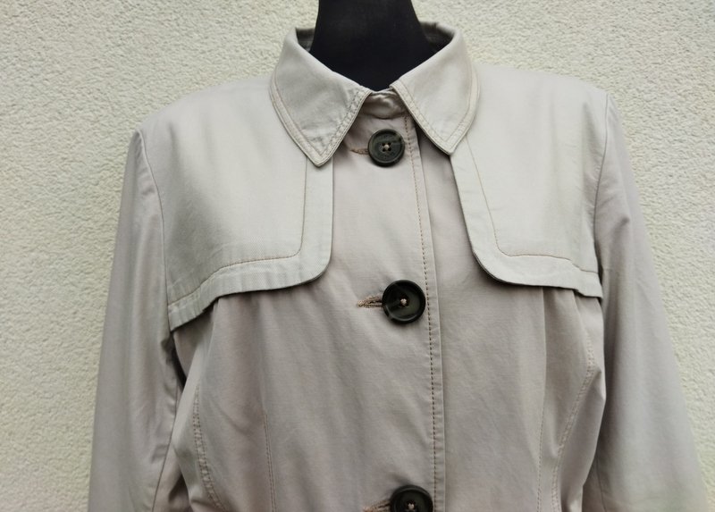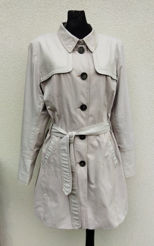 Płaszcz typu trencz z bardzo dobrej jakości tkanin: bawełnianej i bawełniano poliestrowej w identycznym kolorze chłodnego jasnego beżu ( piaskowy odcień). Starannie uszyty i wykończony z licznymi detalami, stębnowany nićmi w nieco ciemniejszym . Zapinany na guziki, z pelerynka z tyłu i imitacja pelerynki z przodu, z dwiema wpuszczanymi kieszeniami, z krytym rozcięciem z tyłu u dołu. Wiązany paskiem w talii , Całość na podszewce.