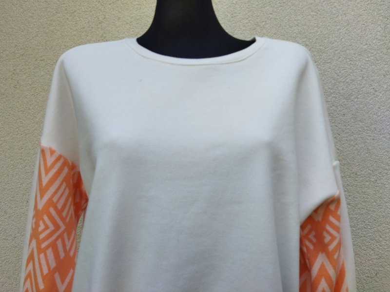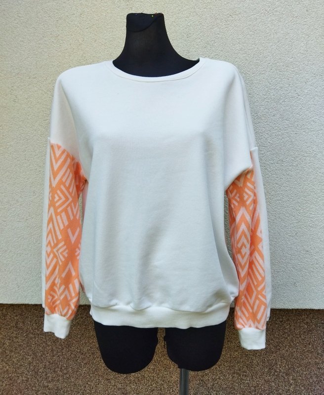 Świetna bluza z dresowej bawełnianej tkaniny dzianinowej z poliestrem w kolorze mlecznej bieli z wzorzystymi rękawami w brzoskwiniowo-pomarańczowym kolorze. Wykończona ściagaczami.