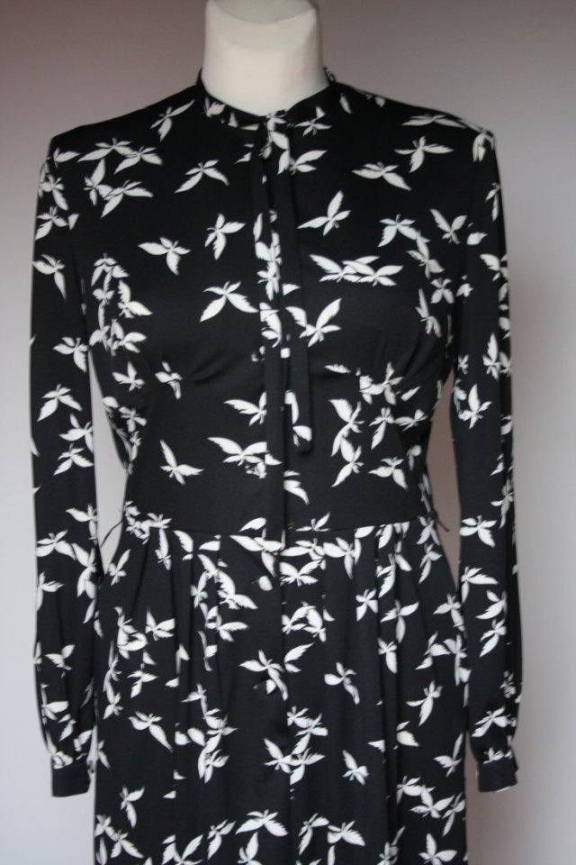 czarna sukienka vintage cała we wzór białych listków, w pasie odcinana, do połowy zapinana na guziki, pod szyją wiązana, rękawy zapinane na guzik, w pasie szlufki - paska brak