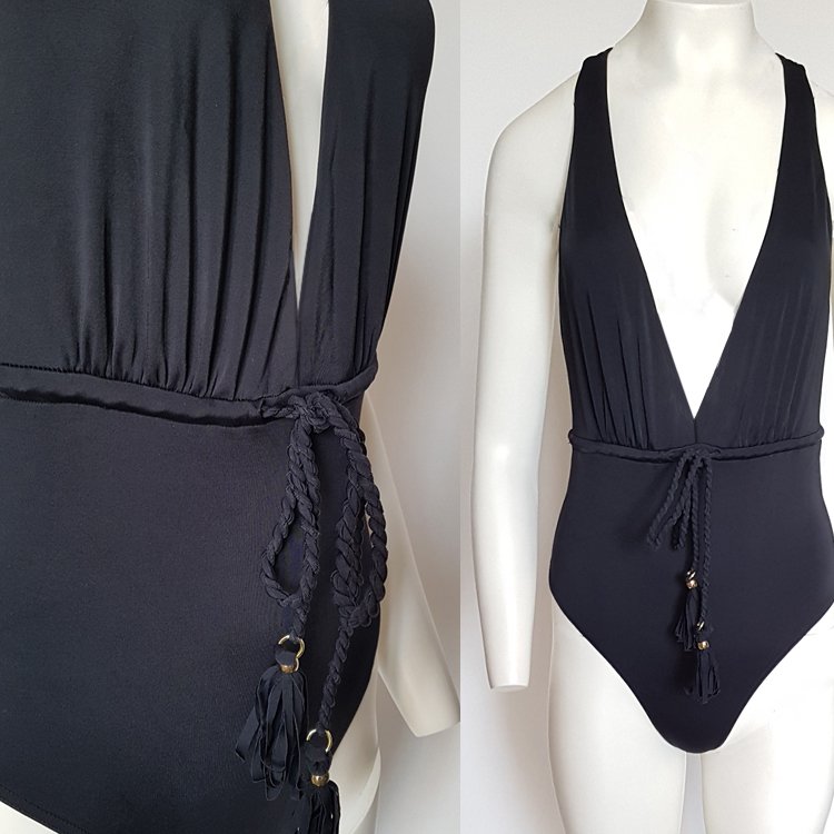 Strój jednoczęściowy w kolorze czarnym. Góra nieusztywniania, talia zebrana elastycznym paskiem wykończonym ozdobnymi chwostami. Dekolt jest regulowany, można go zmniejszyć zapinając na haftkę kilka cm powyżej rozcięcia. Dodatkowo górę można nosić na kilka sposobów, klasycznie lub przekładając oba ramiączka na jedno ramię, lub krzyżując.