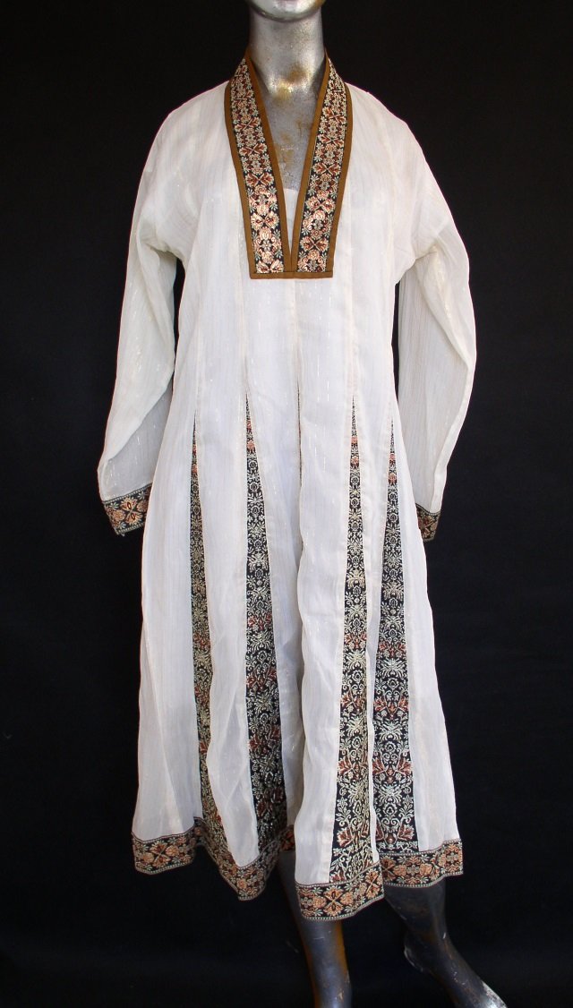 Strojna sukienka bez metek.Materiał wierzchni syntetyk w delikatne,złote nitki.Podszewka biała,syntetyk.Dekolt obszyty ozdobną taśmą.Na wysokości bioder wstawione kliny z ozdobnej taśmy,tylko z przodu.Dół zakończony taśmą.Rękaw długi,prosty.Stan bardzo dobry.Długość 112 cm.pod pachami 106 cm.pas 92 cm.