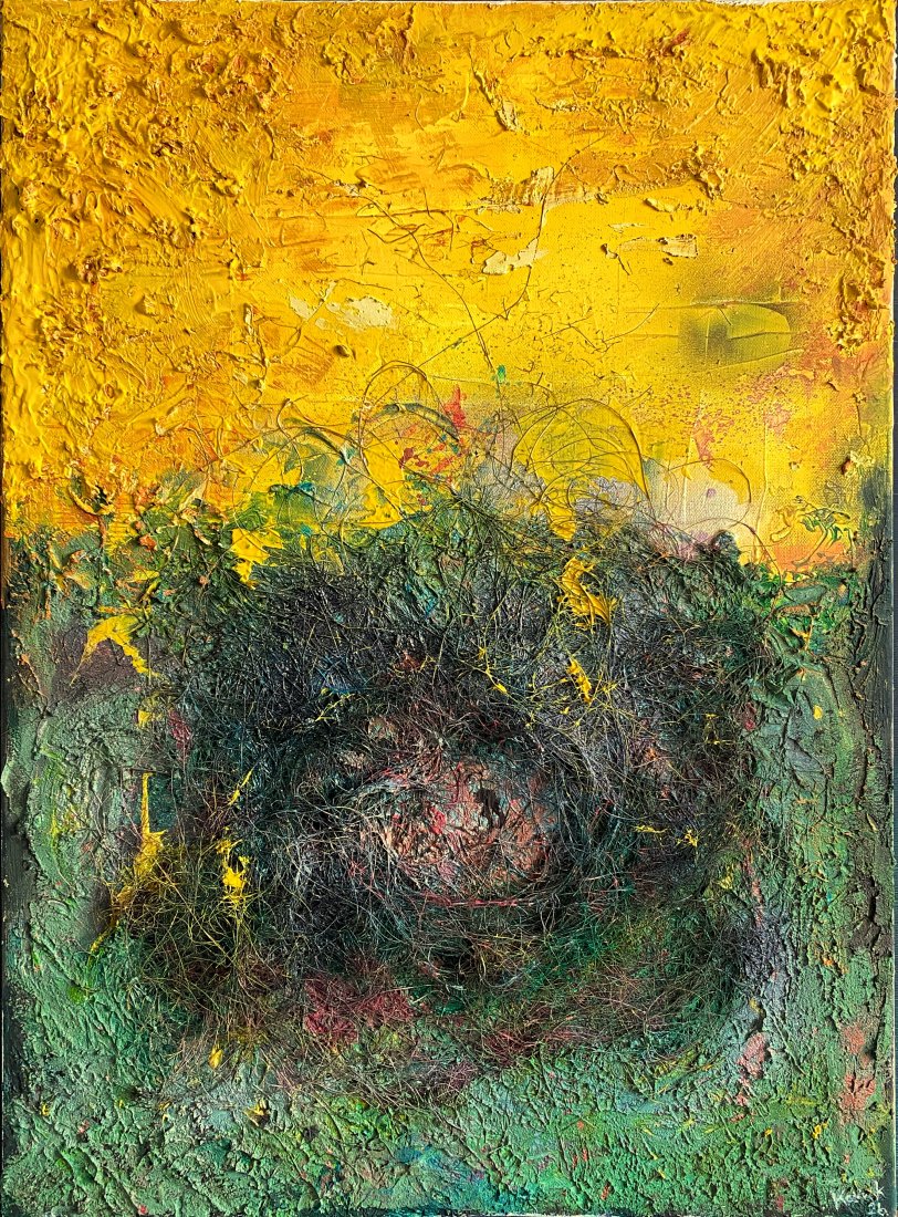"Gniazdo" odnosi się do idei miejsca, w którym coś zaczyna się formować. To przestrzeń skupienia – punkt, w którym różne napięcia, doświadczenia i emocje splatają się i zaczynają organizować w całość. W tej pracy interesuje mnie moment przejścia: chwila pomiędzy chaosem materii a pojawieniem się porządku.