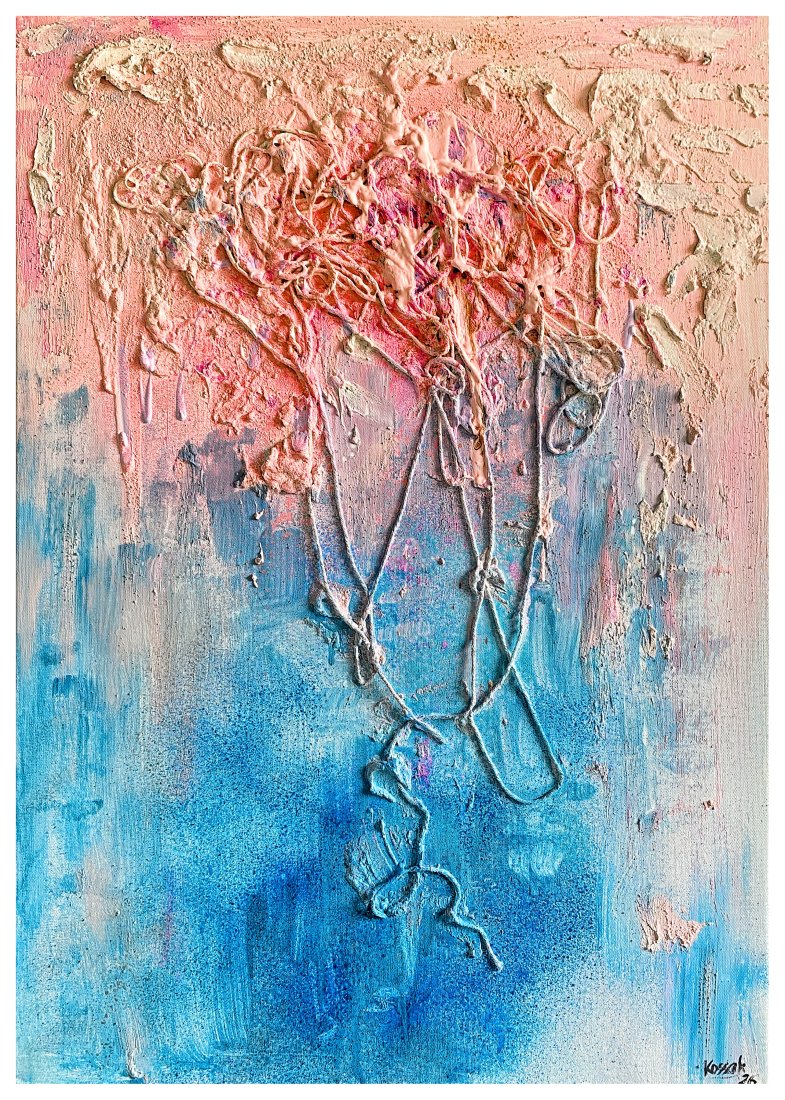 Obraz nie przedstawia upadku. Zatrzymuje się w momencie trwania, kiedy forma jeszcze się utrzymuje, choć jej stabilność nie jest już oczywista. Obecne jest w nim poczucie zmęczenia i wewnętrznego nacisku, które nie prowadzi do dramatycznego gestu, lecz do cichego przekroczenia granicy.