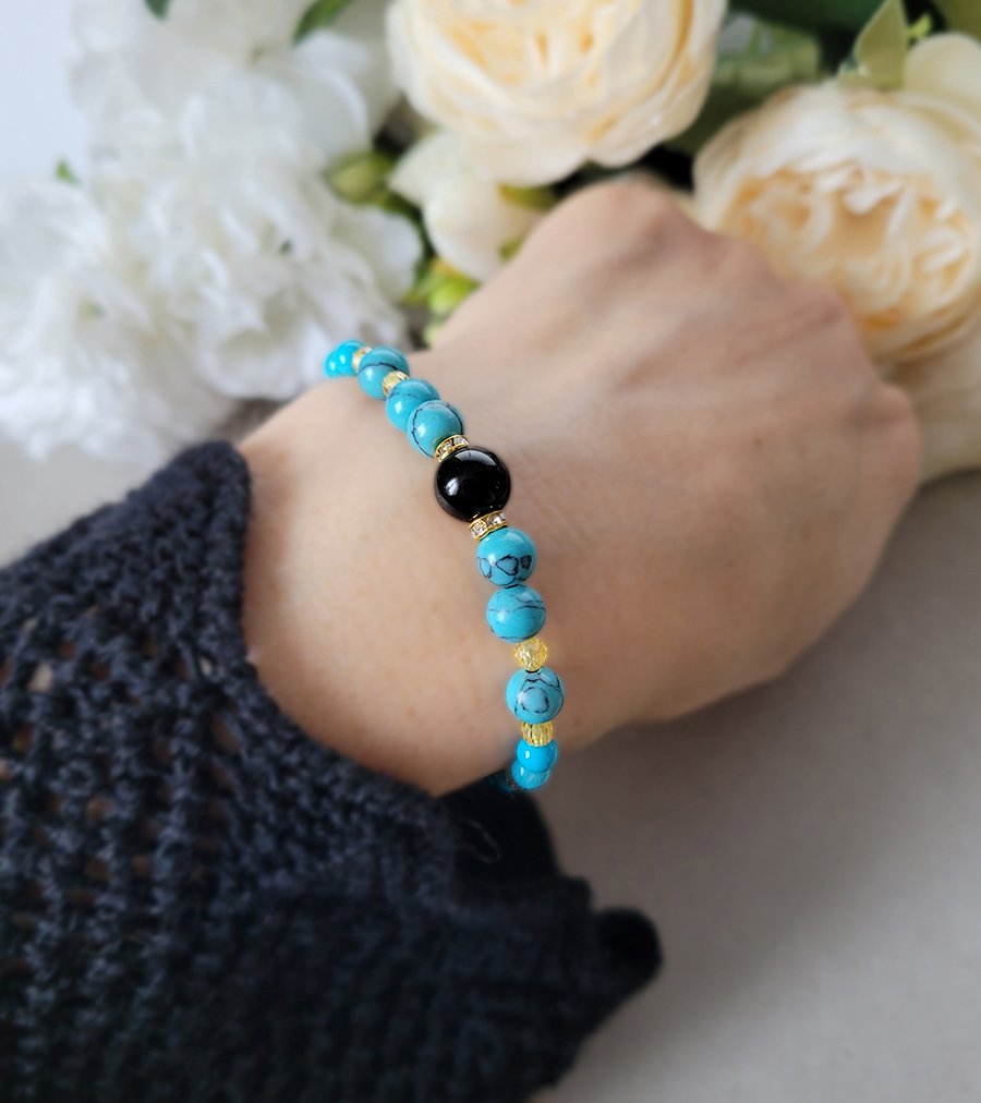 Przepiękna bransoletka zrobiona z kamieni naturalnych: Turmalinu, Onyksu, Turkusu afrykańskiego oraz Hematytu w kolorze złota.