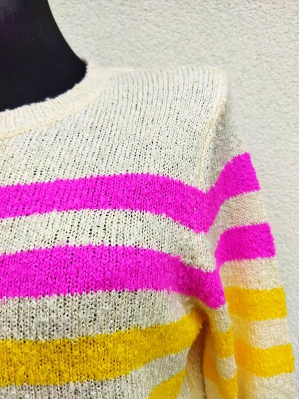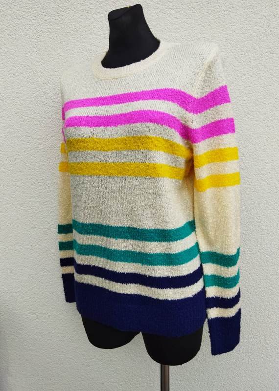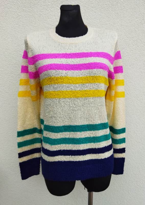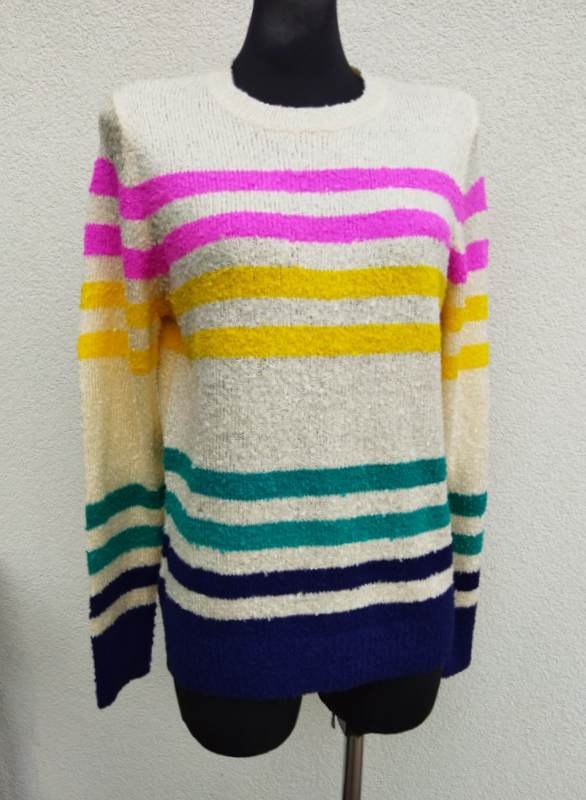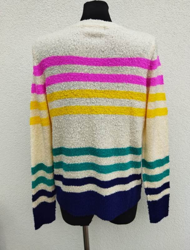 Miły mięciutki sweterek z akrylowej włóczki z fakturą drobne boucle w kremowym kolorze w różowo--żółto- szmaragdowo- granatowe paski. Wykończony ściągaczami.