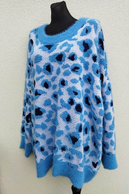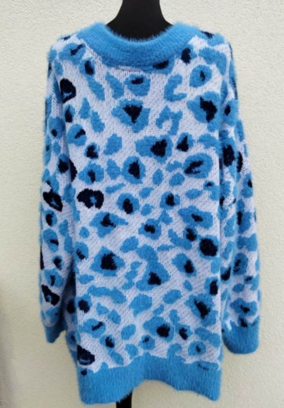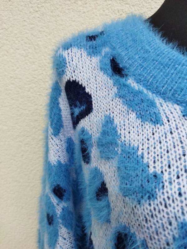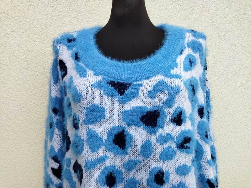 Miły, mięsisty ale mięciutki sweter z akrylowej włóczki z poliamidem z wzorem w niebiesko -czarne cętki na białym tle - niebieska włóczka z puszystym włosem. Owalny dekolt. Wykończony ściągaczami.