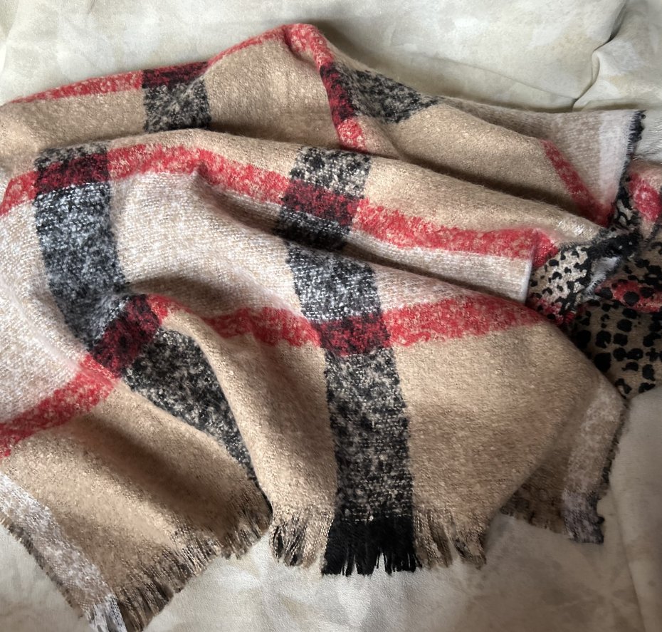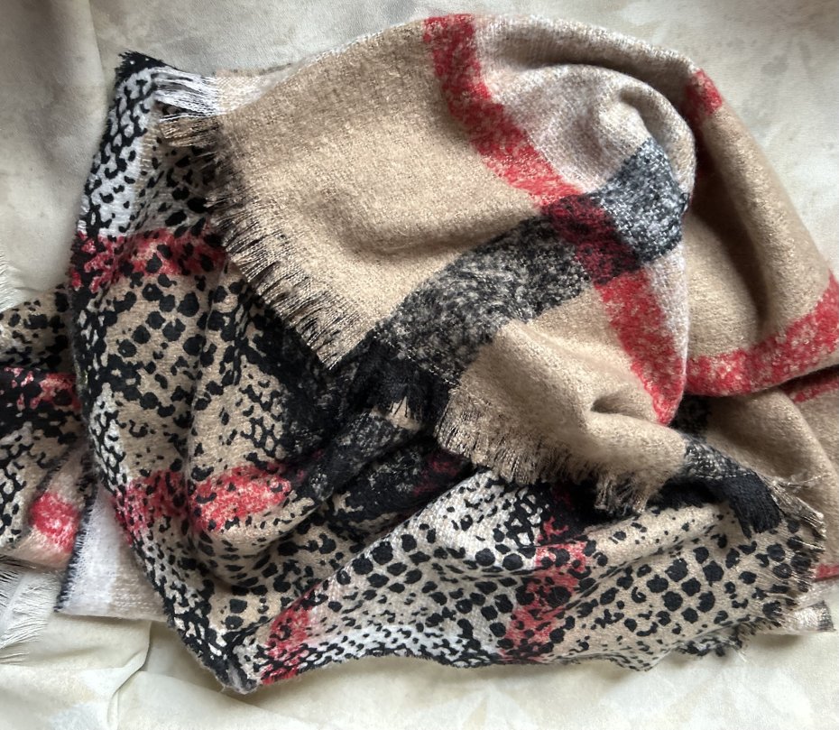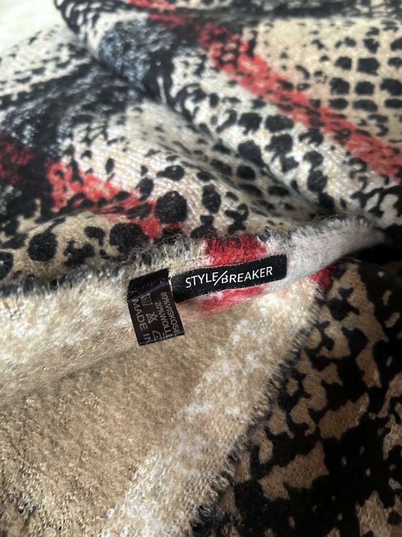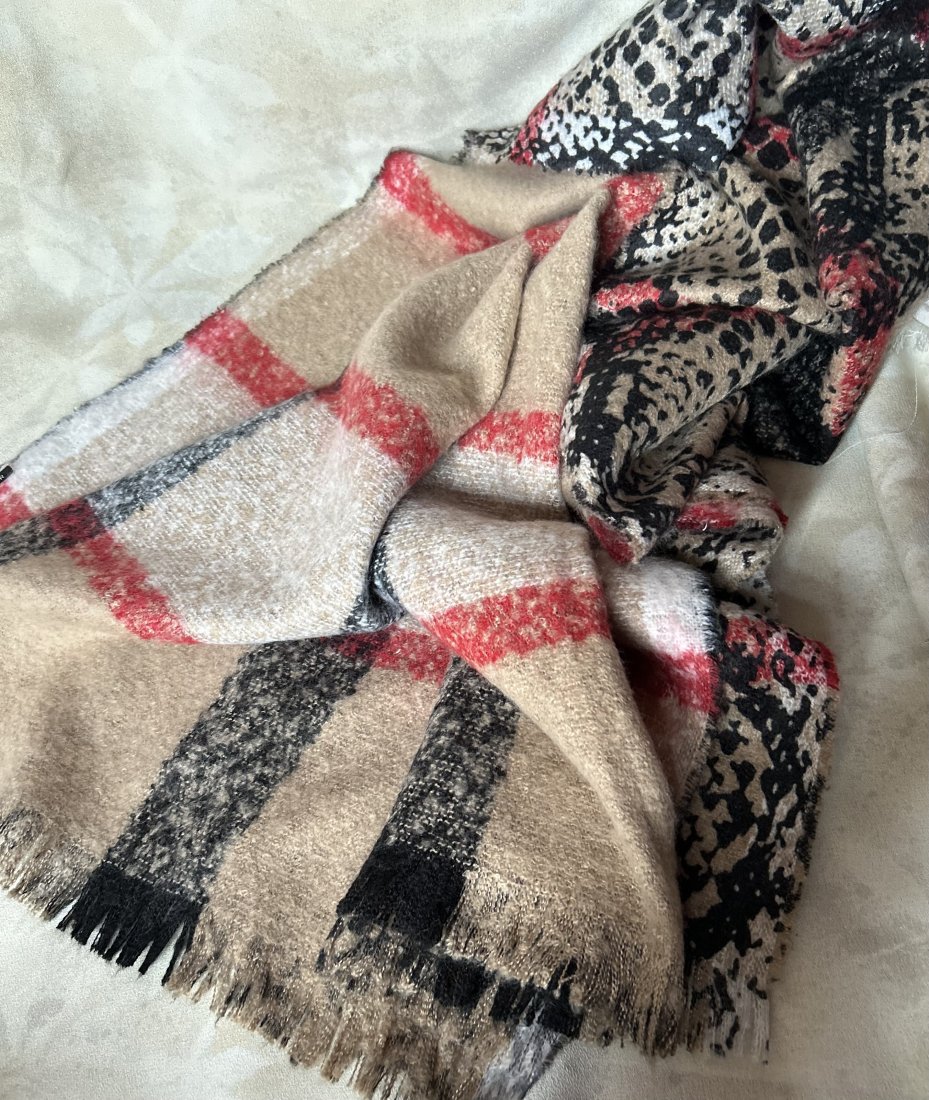 Miękki, bardzo przyjemny w dotyku dwustronny szal ( w zależności od nastroju .. klasyka lub szczypta szaleństwa ) . STYLE/BREAKER 20 % Wool 80 % Viscose . Z jednej strony klasyczna krata z drugiej zaś szaleństwo drapieżnego wzoru. . Szerokość 60 długość trochę ponad 190 cm . Stan zachowania bardzo dobry .