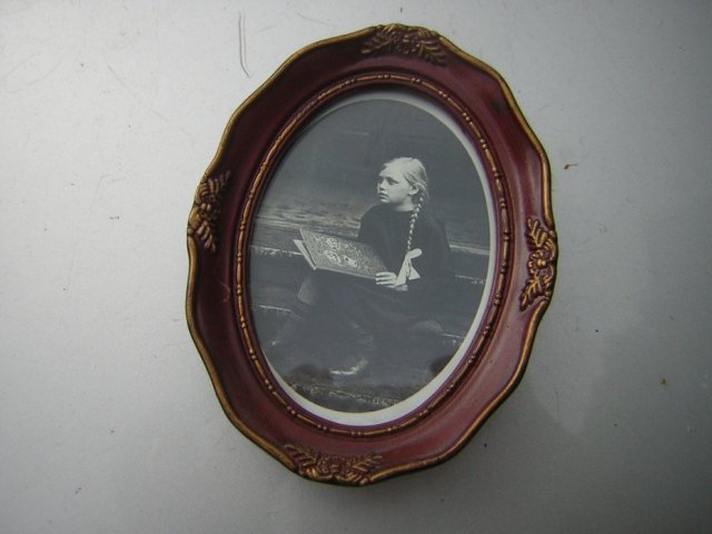 Ciekawa, stylizowana na starą niewielka owalna ramka. Wykonana ze szlachetnego tworzywa idealnie imitującego drewno. Bardzo ładnie wykonana. Ciekawy wiśniowy kolor, delikatne złocone, wypukłe dekoracje. dekoracje. Wykończenie satynowo- błyszczące. Szybka, haczyk do powieszenia.