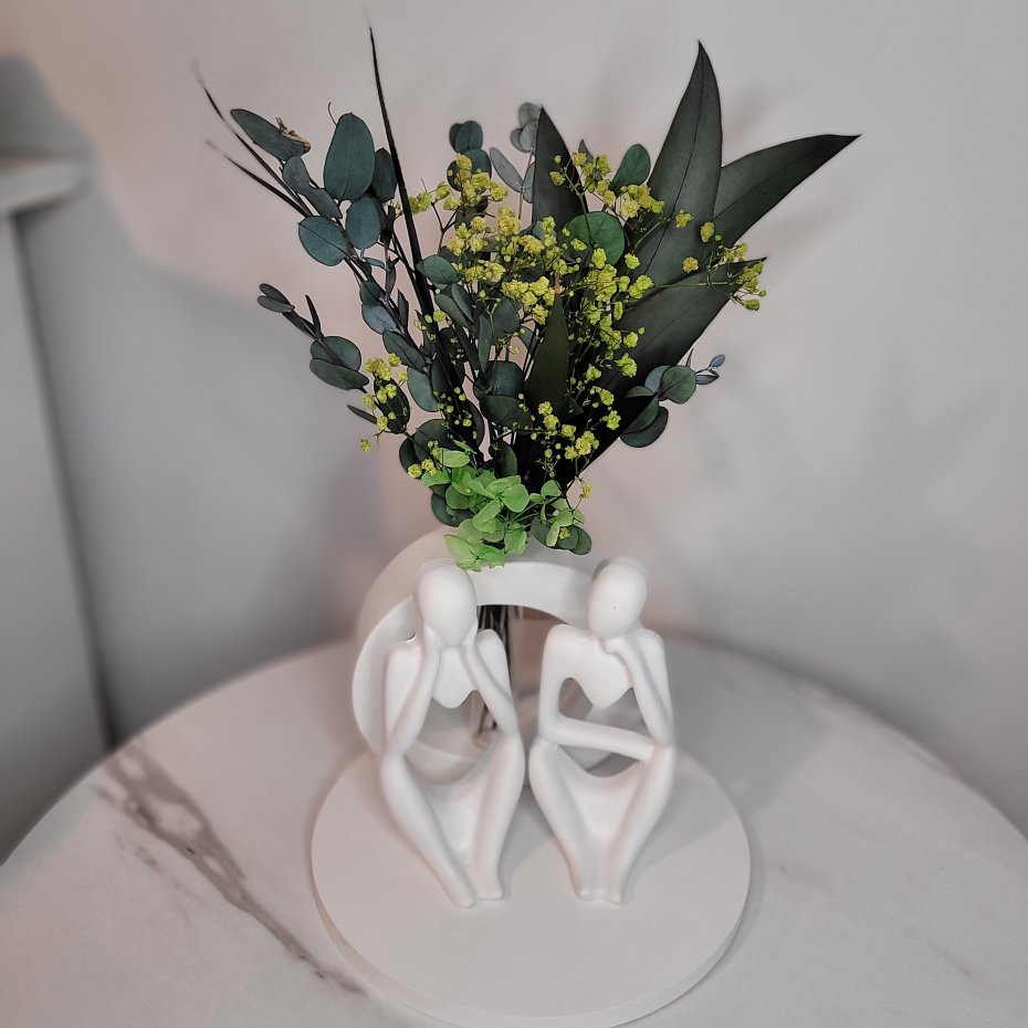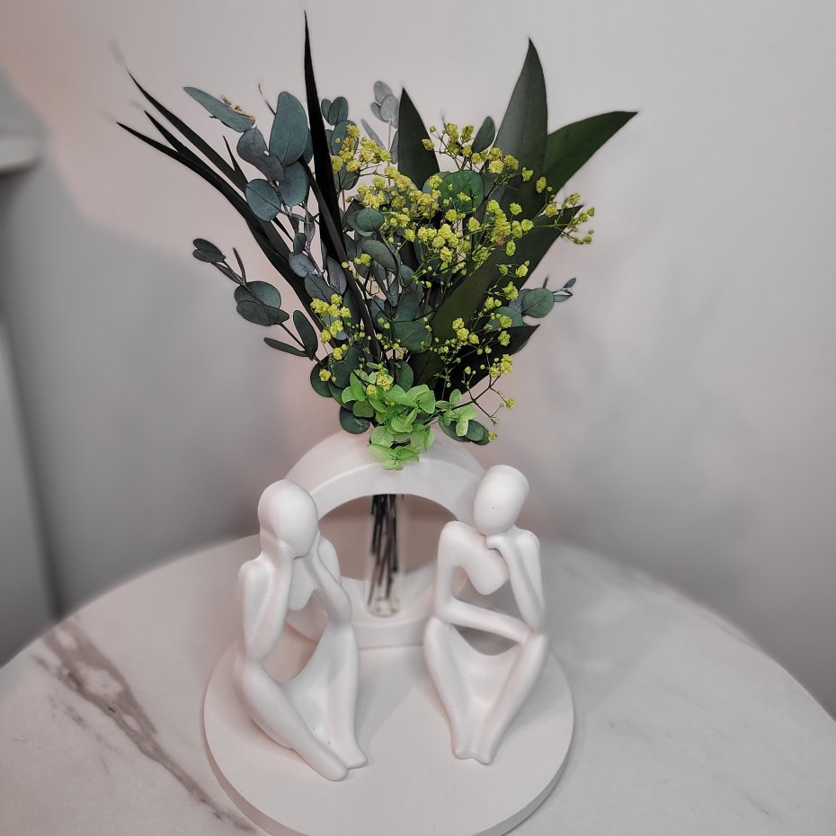 Autorski zestaw z gipsu z wazonem i stabilizowanymi roślinami.