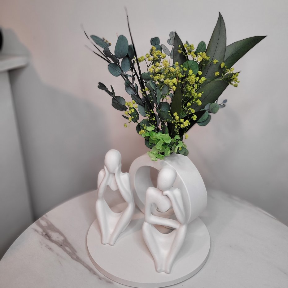 Śnieżnobiałe figurki w nowoczesnym, minimalistycznym stylu symbolizują harmonię i zadumę, a naturalna zieleń dodaje kompozycji życia i równowagi. Zestaw idealnie sprawdzi się w salonie, sypialni, gabinecie lub jako stylowy prezent.