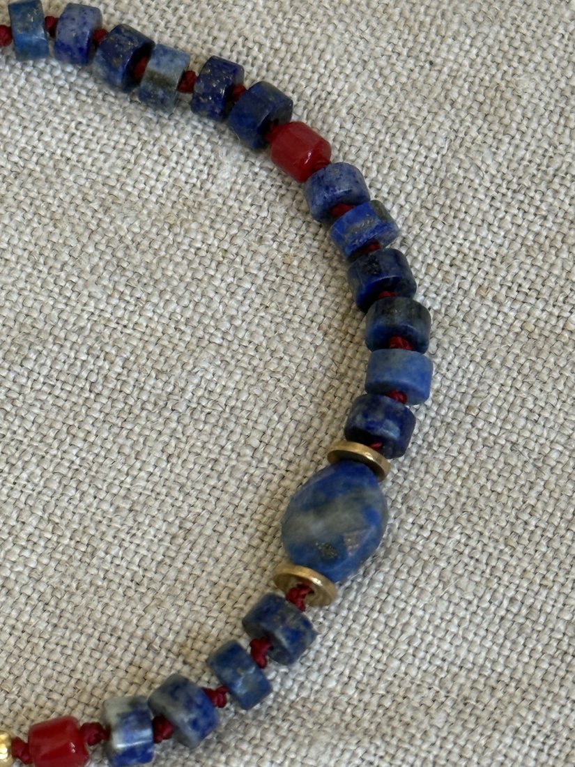 Bransoletka wykonana z kamieni naturalnych - lapis lazuli, koral, przekładki z hematytu. Kamienie supełkowane na czerwonej sznureczku.