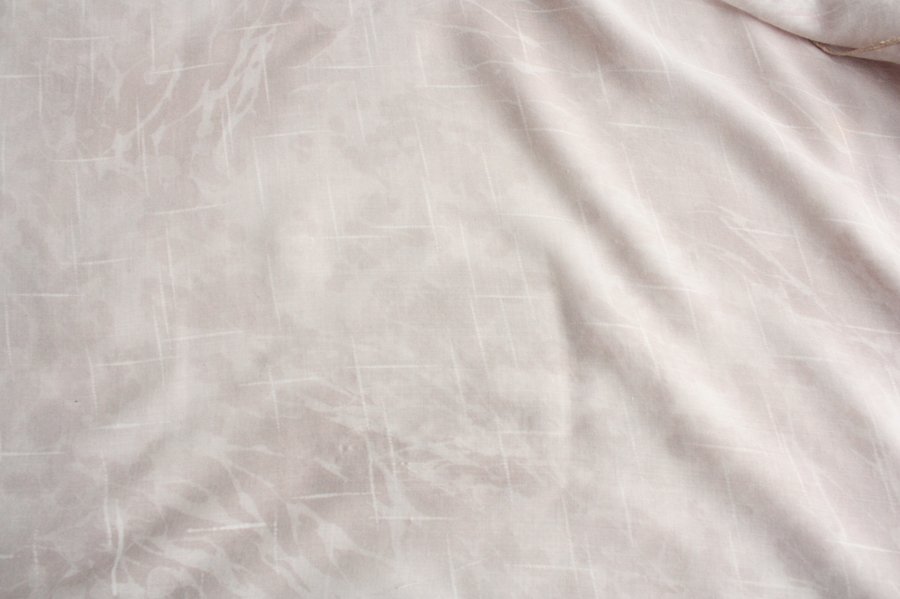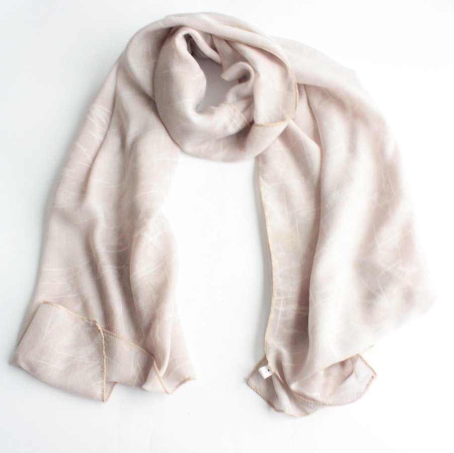 Zwiewny szal w subtelne wzory w odcieniu jasnej szarości z delikatną liliową nutą. Materiał to prawdopodobnie wiskoza.