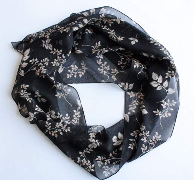 Zwiewny szal w beżowe listki na czarnym tle. Wykonany prawdopodobnie z poliestru.