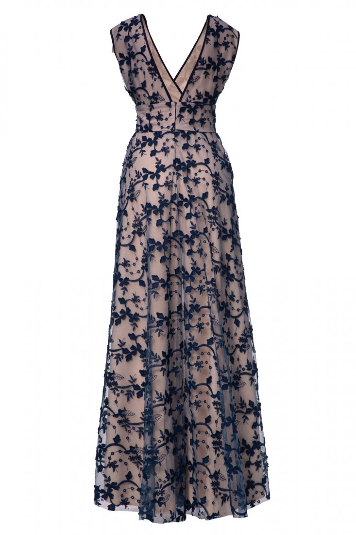 Sukienka maxi uszyta z siateczki haftowanej w motyw roślinny z efektem 3D w kolorze jasnego granaty na podszewce z cielistej wiskozy. Materiały nie są elastyczne. Góra dopasowana z kopertowym dekoltem i szerokim pasem w talii, dekolt na plechach, dół lekko rozkloszowany . Przed zakupem prosimy o dokładne zmierzenie sylwetki. Będzie pasować na rozmiar: