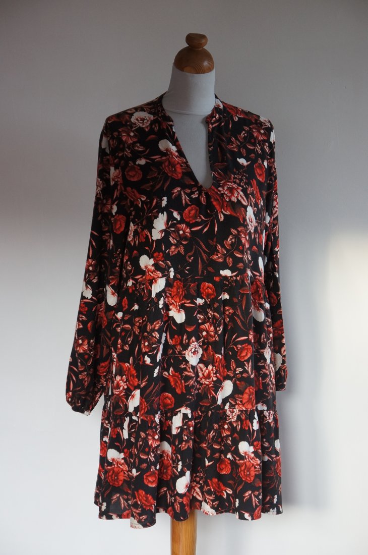 Sukienka marki Amisu. Długość do połowy kolana. Długie rękawy zakończone gumeczką. Sukienka odcięta w pasie, lekko marszczona. Na dole falbana. Ciemna kolorystyka. Dekolt - pęknięcie. Stan bardzo dobry.