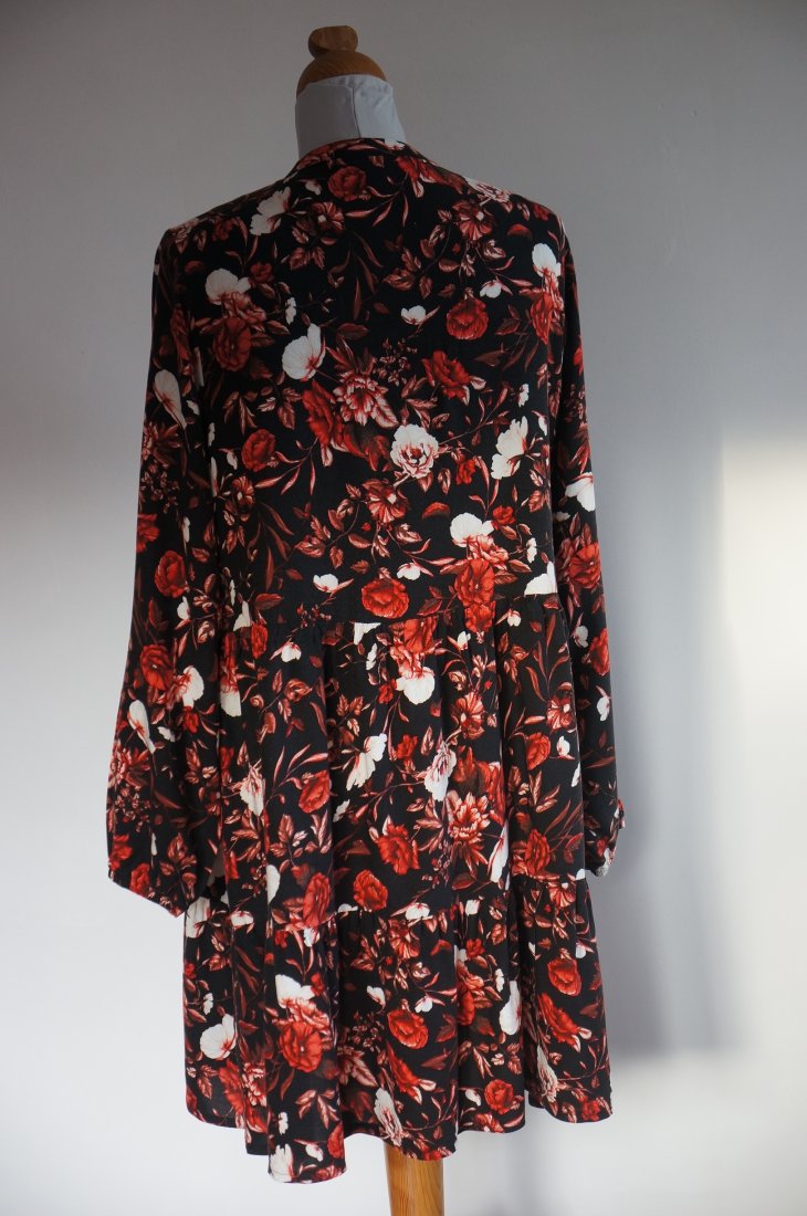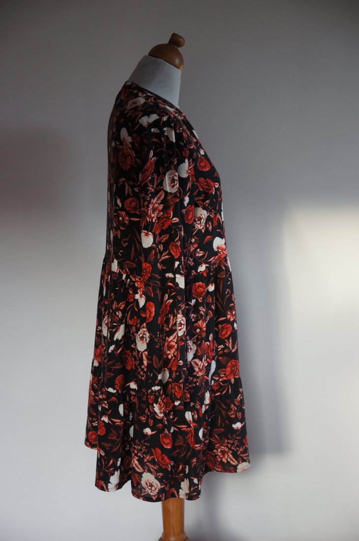 Sukienka marki Amisu. Długość do połowy kolana. Długie rękawy zakończone gumeczką. Sukienka odcięta w pasie, lekko marszczona. Na dole falbana. Ciemna kolorystyka. Dekolt - pęknięcie. Stan bardzo dobry.