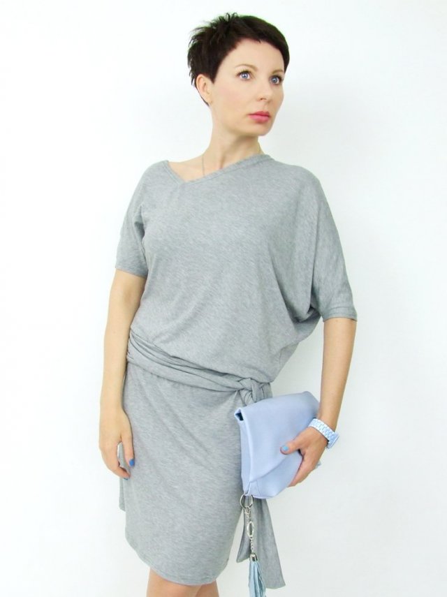 NOWOŚĆ Sukienka tunika asymetryczna w kolorze szarym wykonana z wysokogatunkowej wiskozy z paskiem który można dowolnie zawiązać i asymetrycznym dekoltem idealna propozycja na sportowo i nie tylko