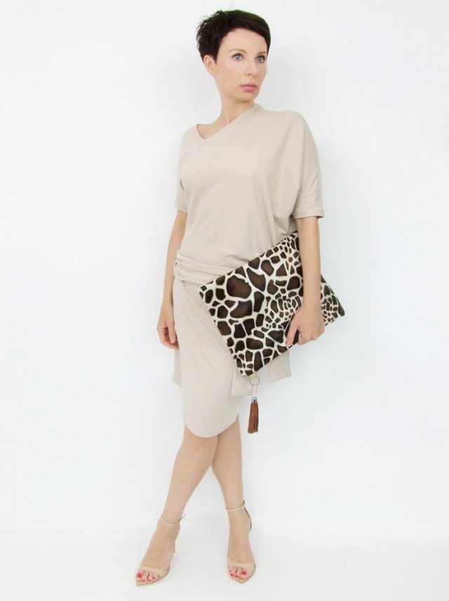 NOWOŚĆ Sukienka tunika asymetryczna w kolorze beżowym wykonana z wysokogatunkowej bawełny cienkiej dresówki z paskiem który można dowolnie zawiązać i asymetrycznym dekoltem idealna propozycja na sportowo i nie tylko