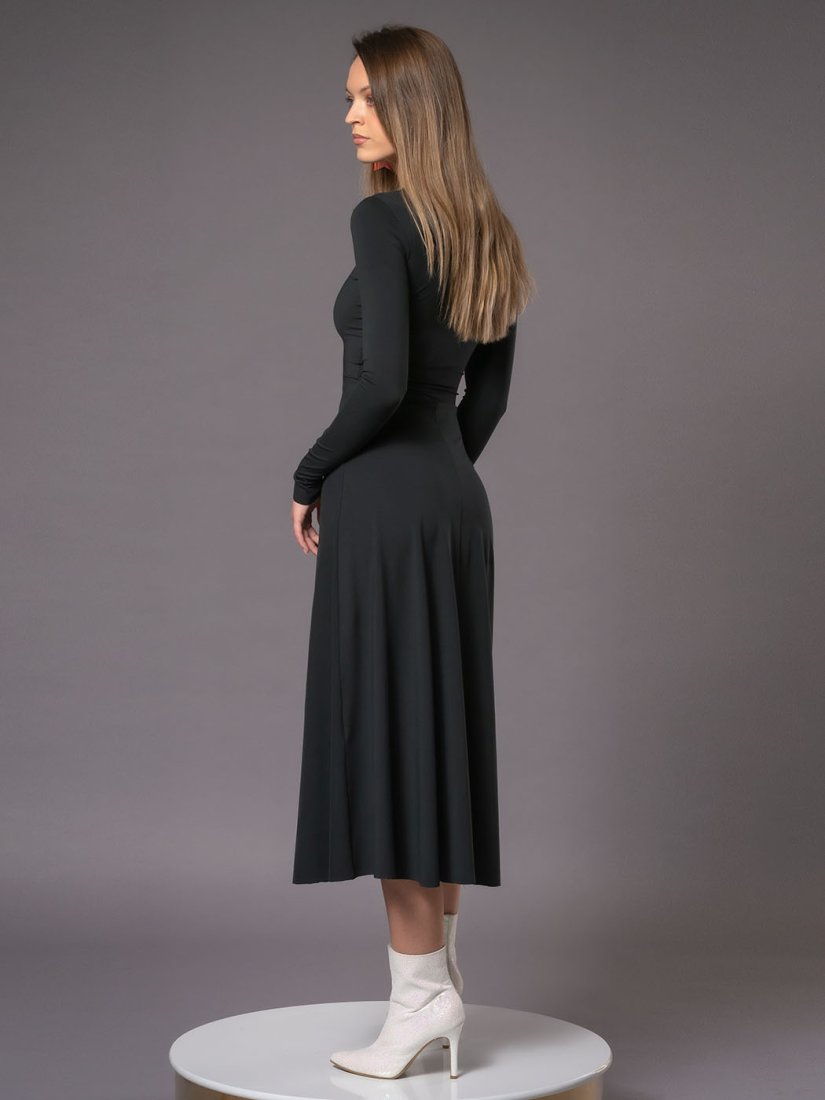 Dopasowana góra z zabudowanym dekoltem i długim rękawem podkreśla sylwetkę, a dół w literę "A" nadaje całości lekkości i świetnie układa się w ruchu.