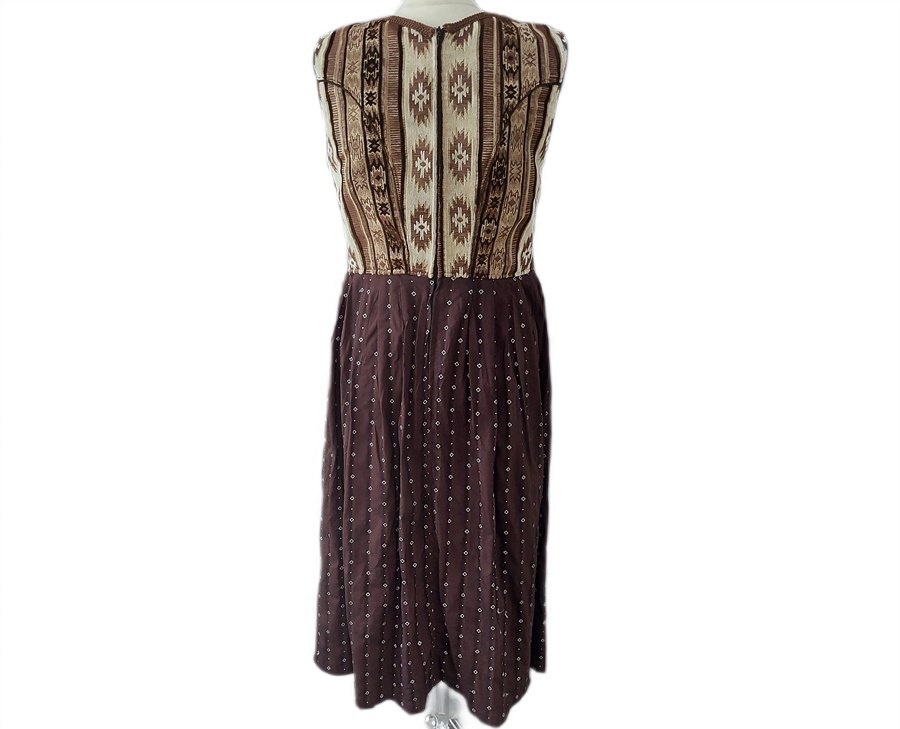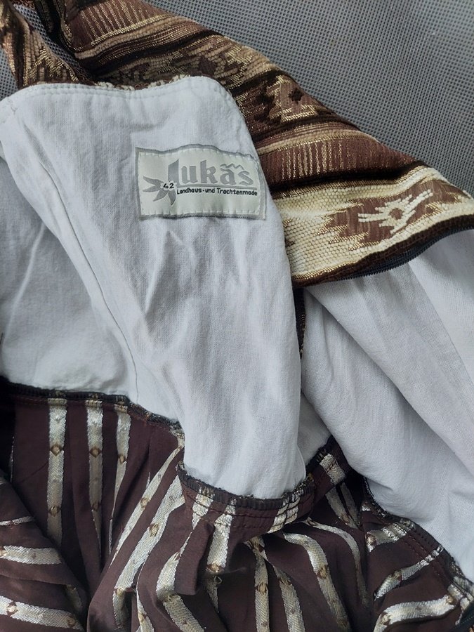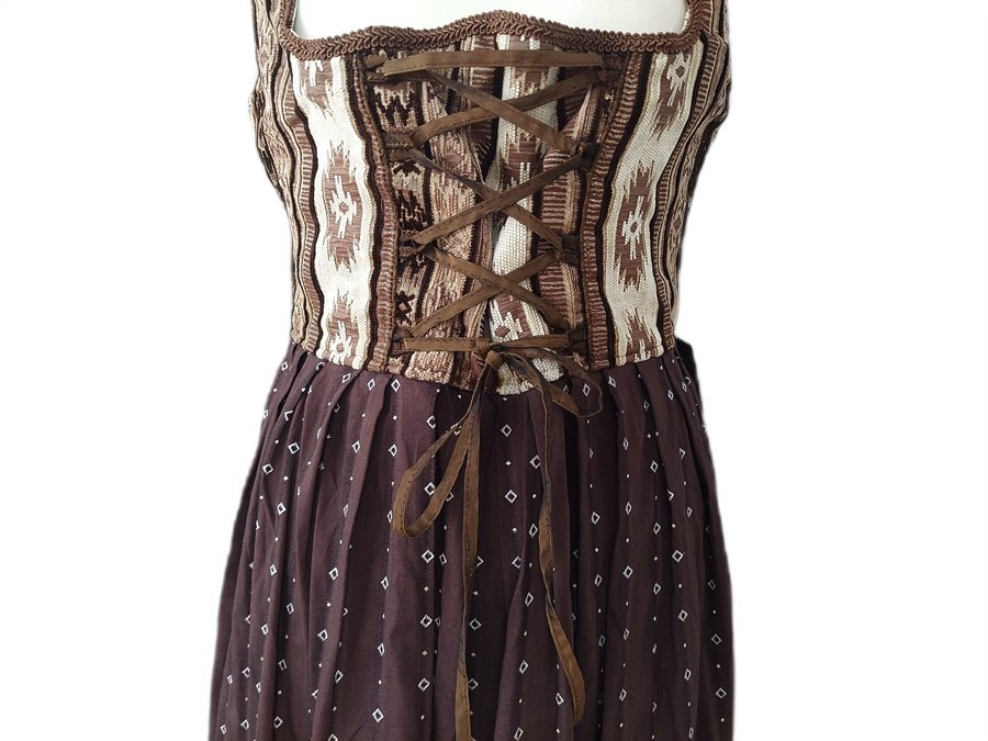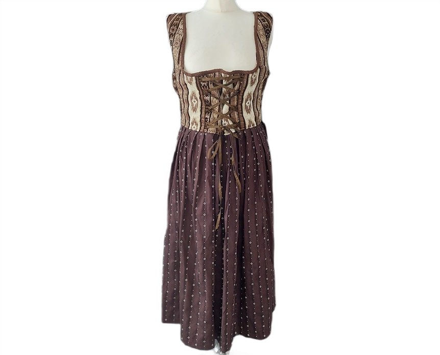 Sukienka bawarska utrzymana w ciepłej, brązowej tonacji. Góra wykonana z tłoczonej, tkaniny o wyraźnej fakturze, dół zdobiony delikatnym, drobnym wzorem. Założysz ją nie tylko na Oktoberfest, ale też na bal tematyczny, babski comber czy podobne imprezy.