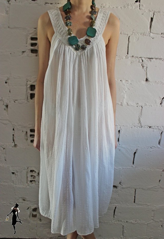 Sukienka biała. Rozmiar uniwersalny. Wymiary: obwód biustu-80cmx2, obwód bioder-125cmx2, długość sukienki-120cm. Skład materiału: 75% bawełna, 25% wiskoza.