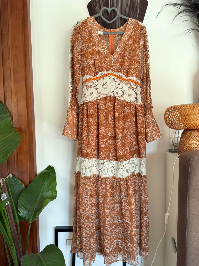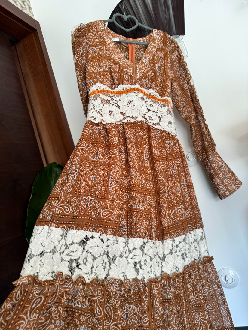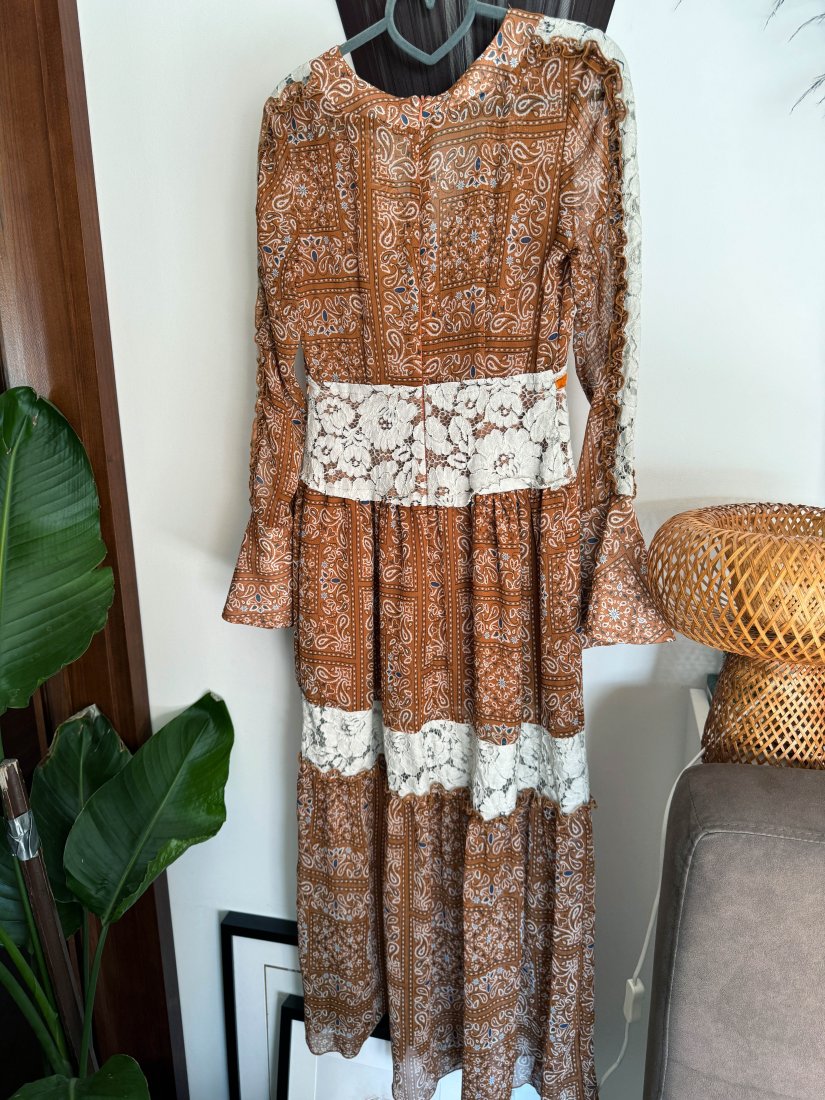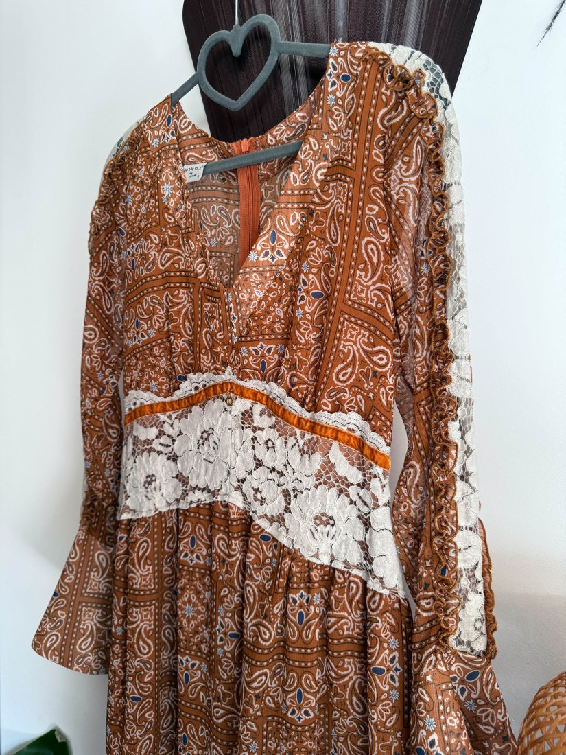 Śliczna sukienka boho By o la la.... Falbany, koronka, piękne rękawy. Zamszowa wstawka pod biustem. Posiada podszewkę do połowy długości. Zapinana z tyłu na zamek. Idealnie dopasowuje się do figury.
