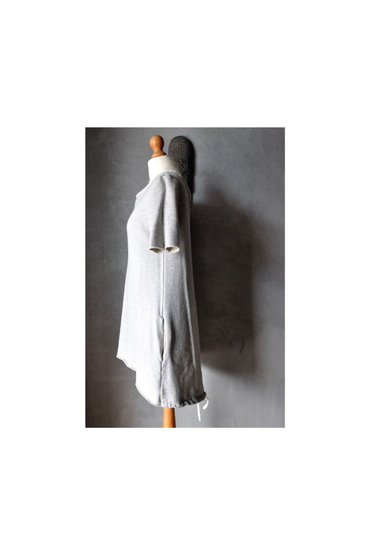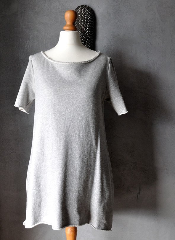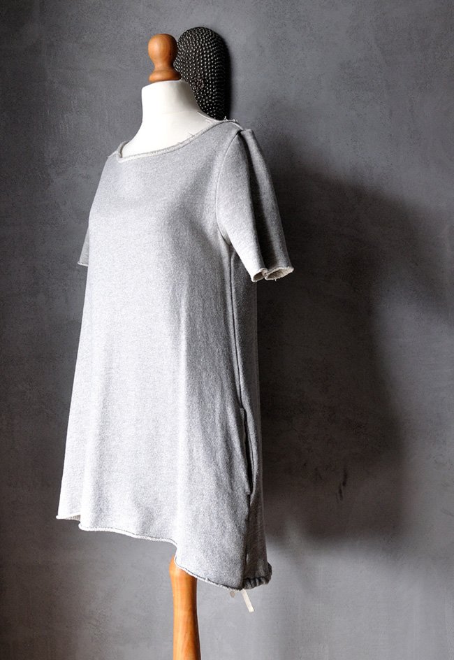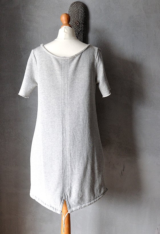 Uszyta z grubszej, miękkiej dzianiny melanżowej w szarościach - takiej jak na dresy. Przód sukienki (bez rękawów) z wplecioną, delikatnie połyskującą na srebrno metaliczną nitką. Połysk jest przyjemny, bardzo delikatny - nie wali po oczach, trudno go uchwycić na zdjęciach.