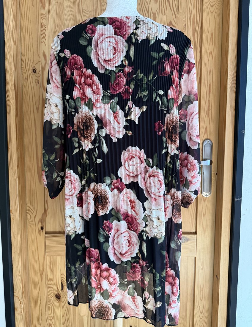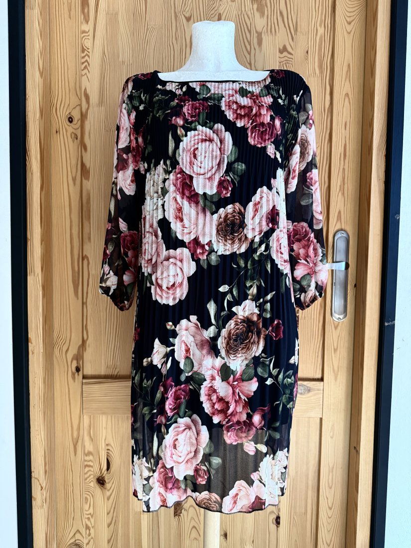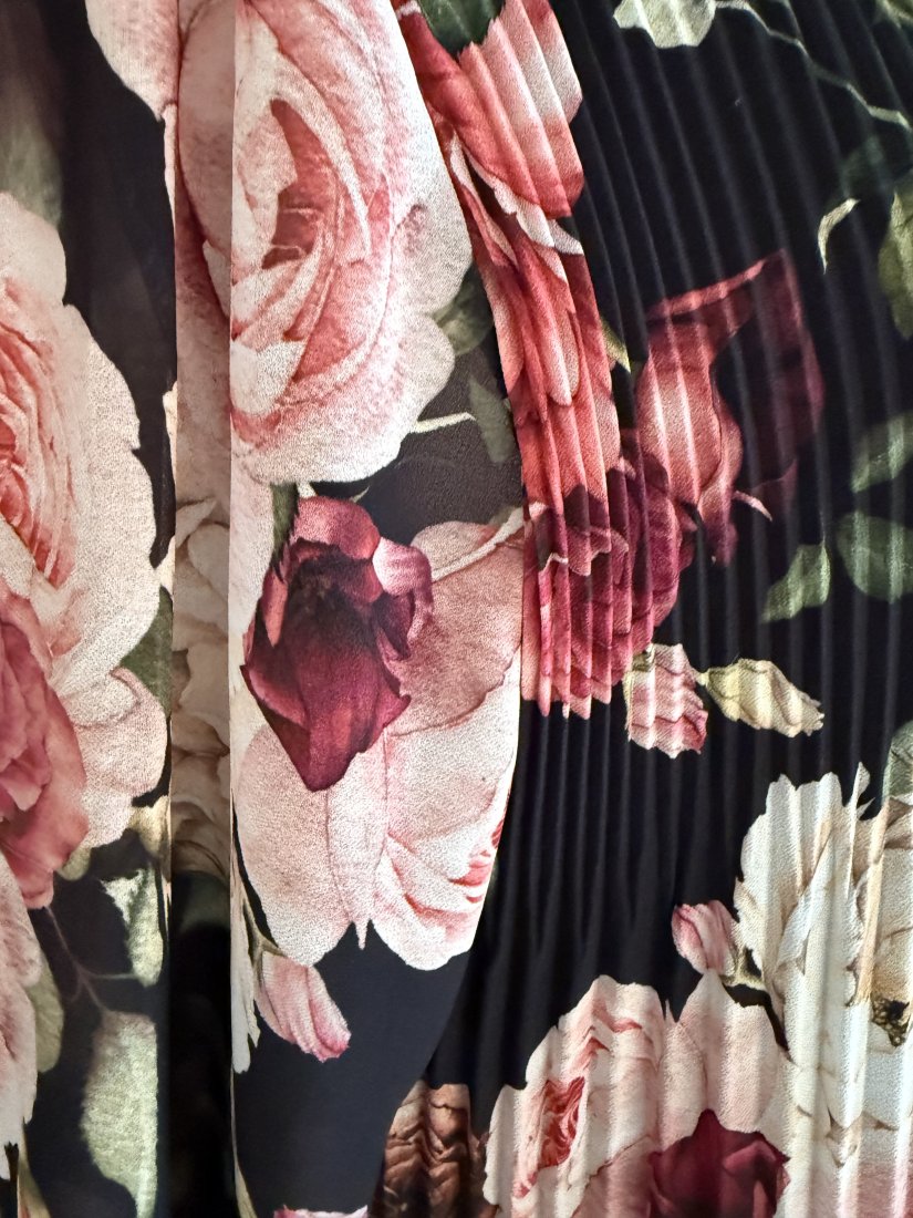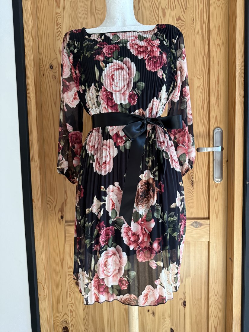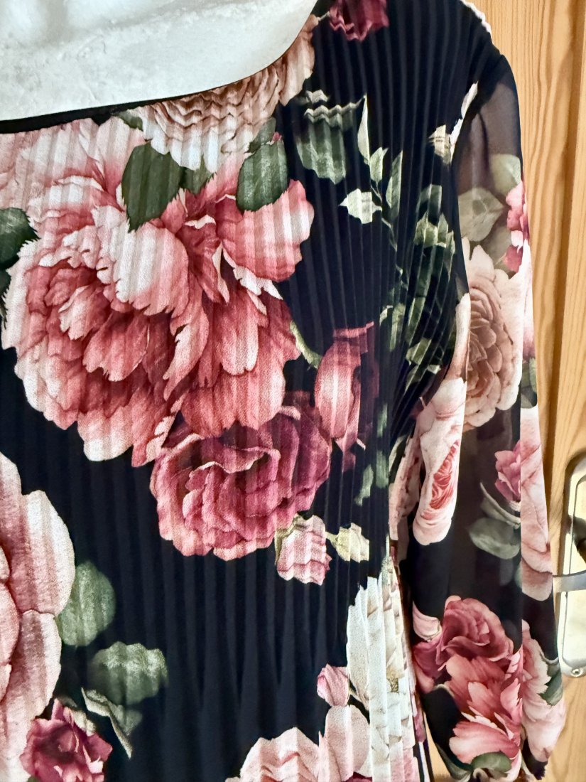 Sukienka dwuwarstwowa, motyw różany. Podszewka, szyfon drukowany w róże, dodatkowo czarna taśma. Rozmiar uniwersalny, M-L. Stan bardzo dobry. Materiał syntetyczny.