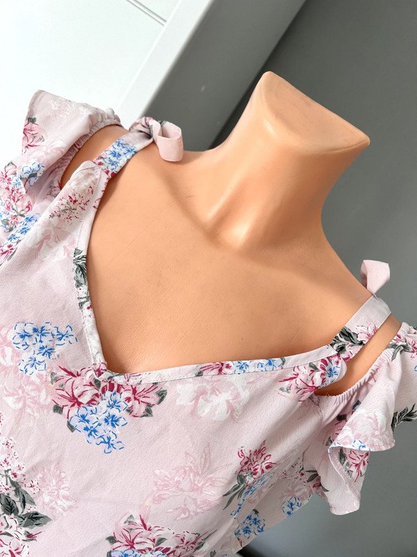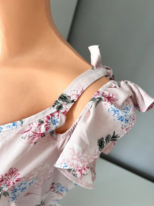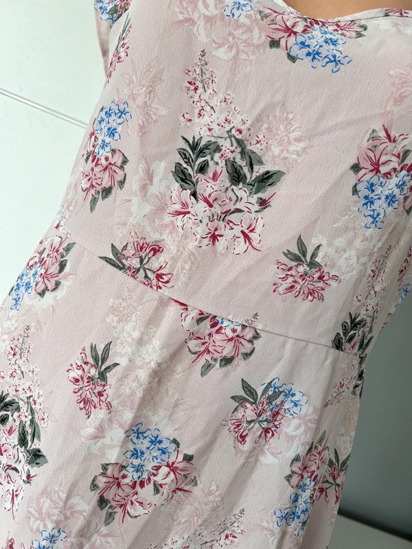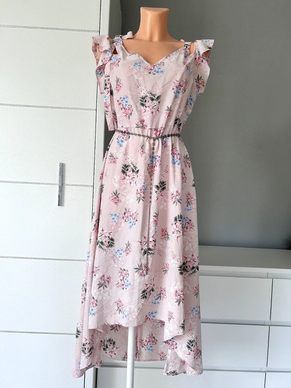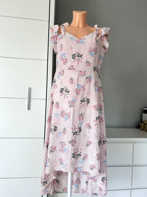 Sukienka firmy George w rozmiarze 42 XL. Odcięta w pasie, z tyłu zamek, dekolt v, podwójne ozdobne ramiączka, jedne wiązane, drugie z falbanką. Piękny kolor pudrowy róż w kwiatowy wzór. Z przodu krótsza, z tyłu dłuższa. Polecam